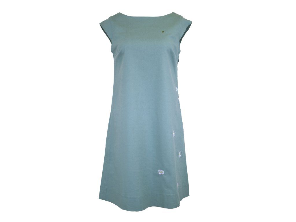 Dámské šaty z pevného materiálu. Tvarovány prsními záševky. Jednoduchá silueta do A. Skrytý zip pro snadnější oblékání. Dvě skryté kapsy v bocích. Vrchní díl podšitý podsádkou s krátkými zdvojenými rukávky. Volnější střih pro pohodlnější nošení.