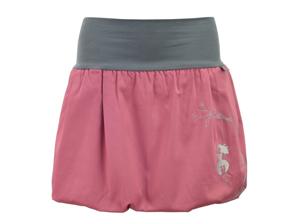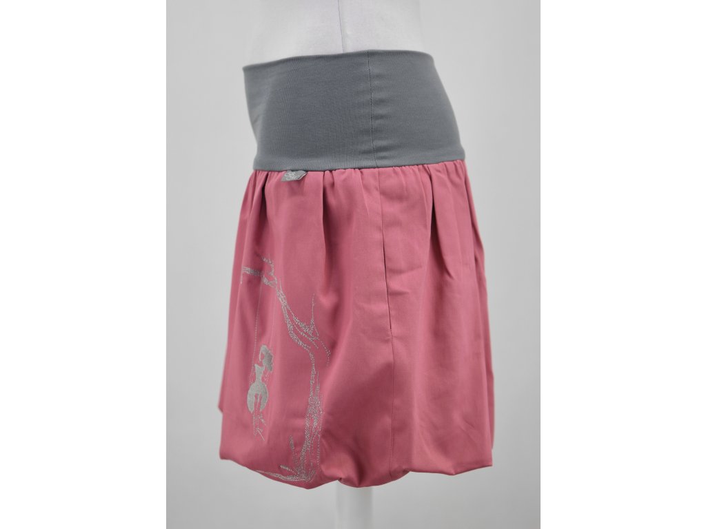 Dámská sukně balonového střihu s dvojitým elastickým pasovým okrajem vhodným pro většinu velikostí. Podšité polyesterovou látkou, která je vhodná jak na punčochy, tak holé nohy a sukně se dá nosit celoročně. Z rubu elastického pasu je nechán otvor na případné vložení gumy na zpevnění či stažení pasu – vhodné pro velikost XS.