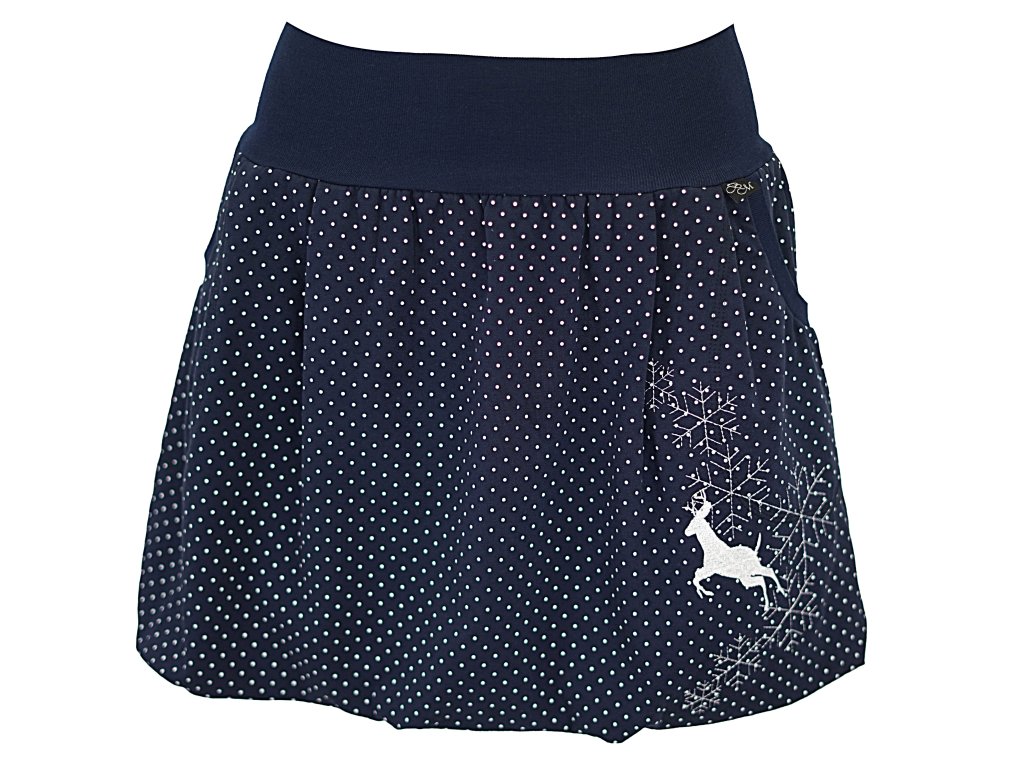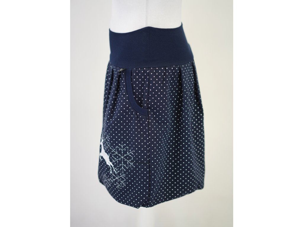 Dámská sukně balonového střihu s dvojitým elastickým pasovým okrajem vhodným pro většinu velikostí. Podšité polyesterovou látkou, která je vhodná jak na punčochy, tak holé nohy a sukně se dá nosit celoročně. Z rubu elastického pasu je nechán otvor na případné vložení gumy na zpevnění či stažení pasu – vhodné pro velikost XS.