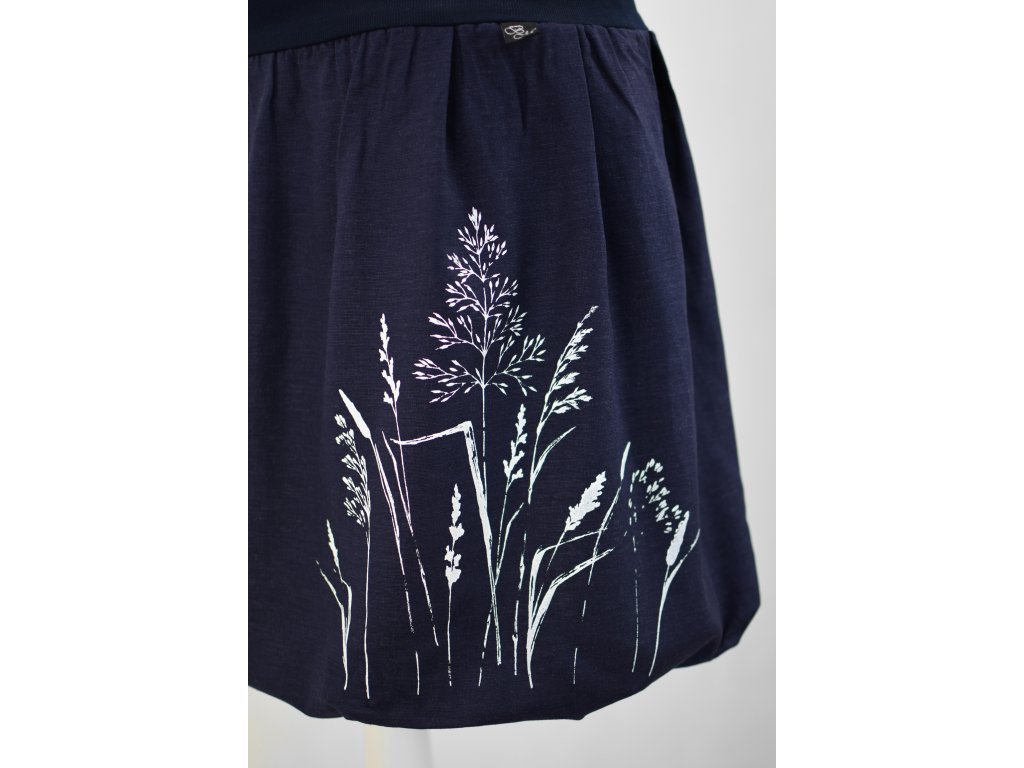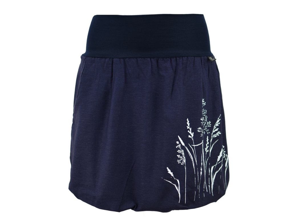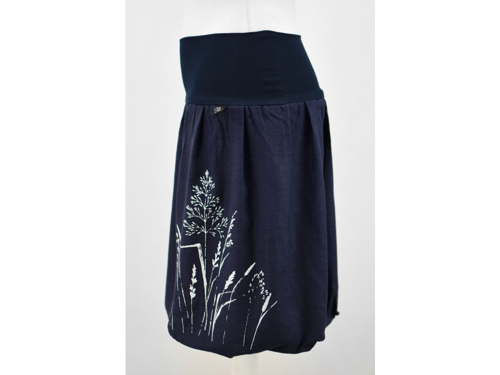 Dámská sukně balonového střihu s dvojitým elastickým pasovým okrajem vhodným pro většinu velikostí. Podšité polyesterovou látkou, která je vhodná jak na punčochy, tak holé nohy a sukně se dá nosit celoročně. Z rubu elastického pasu je nechán otvor na případné vložení gumy na zpevnění či stažení pasu – vhodné pro velikost XS. Traviny jsou tvořeny metodou sítotisku.