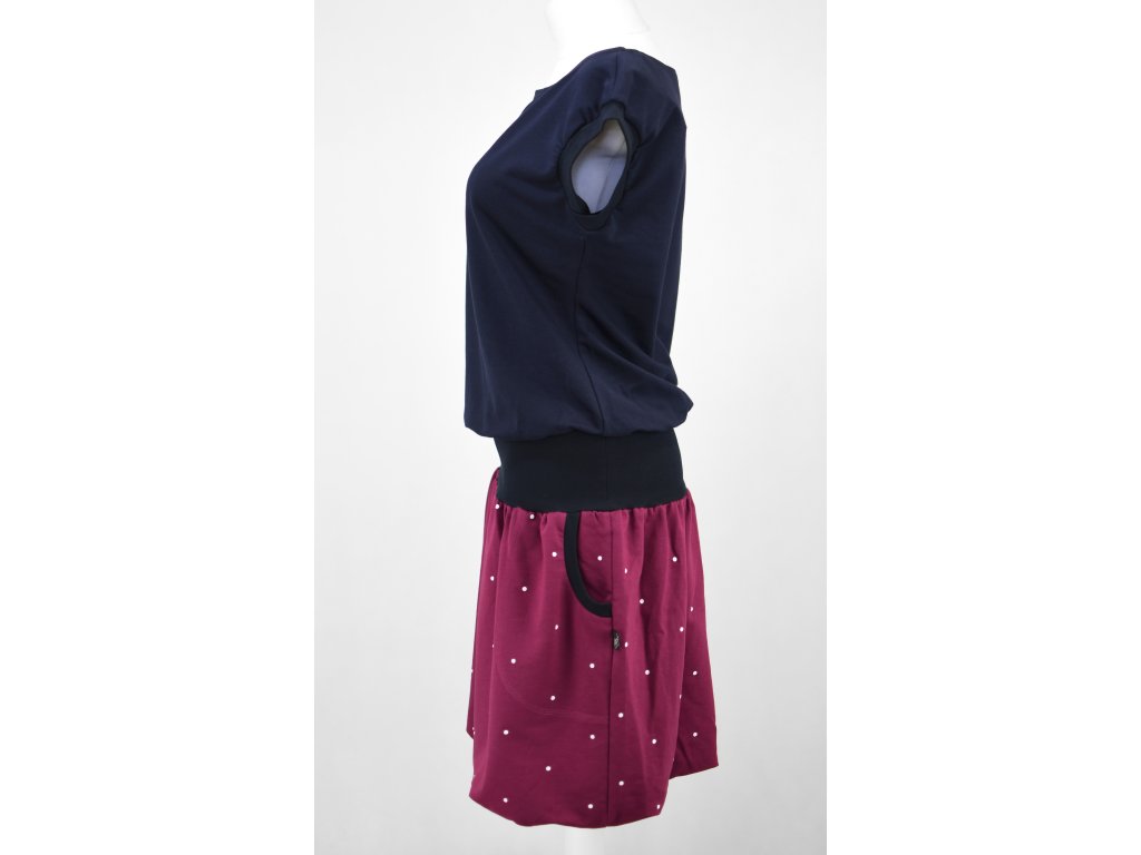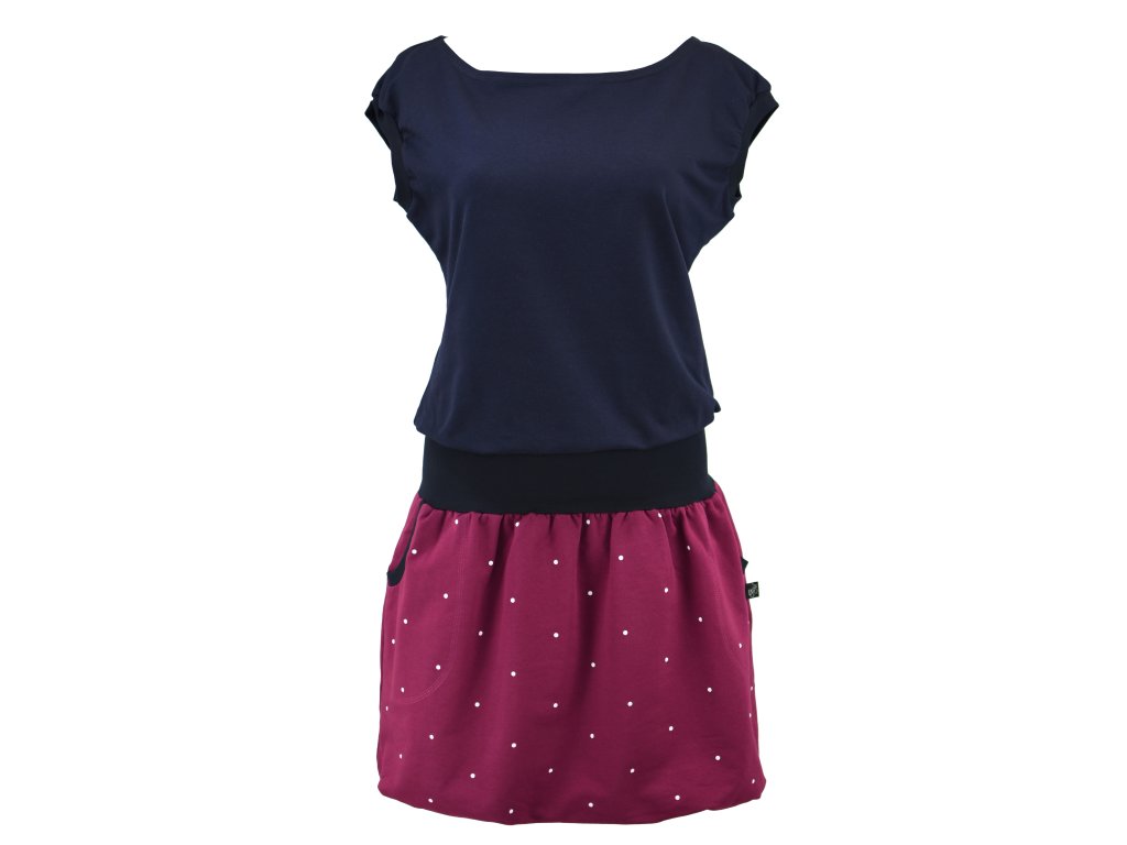 Dámská šatovka přestřižená v bocích ve variantě s nápletem, stažené gumičkou. Sukně je vypodšívkovaná s kapsami v bocích, průramky lemované úpletem. Dá se nosit samotná bez rukávů, anebo s tričkem.. :)