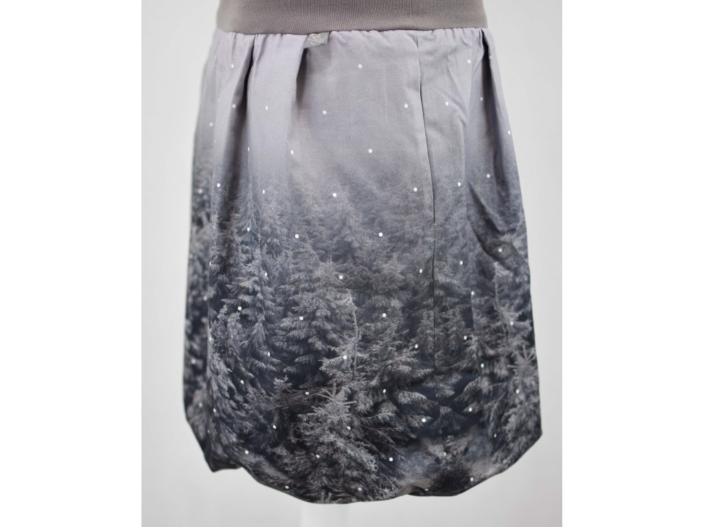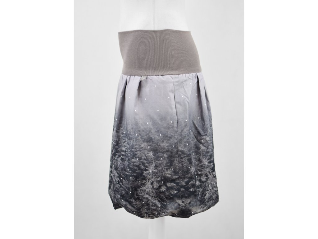 Dámská sukně balonového střihu s dvojitým elastickým pasovým okrajem vhodným pro většinu velikostí. Podšité polyesterovou látkou, která je vhodná jak na punčochy, tak holé nohy a sukně se dá nosit celoročně. Z rubu elastického pasu je nechán otvor na případné vložení gumy na zpevnění či stažení pasu – vhodné pro velikost XS.