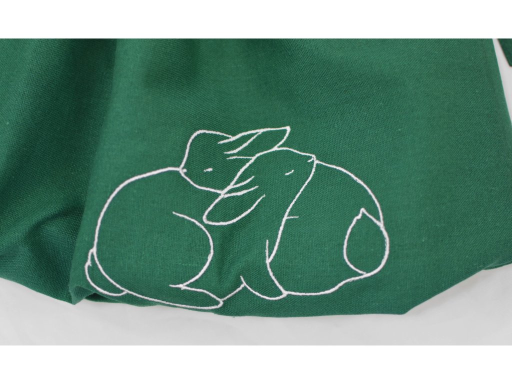 Dětská sukně balonového střihu s dvojitým elastickým pasovým okrajem. Podšité polyesterovou látkou, která je vhodná na punčošky i holé nohy. V pase je nechán otvor a jím protažená stuha, která pas stáhne a zároveň je zdobným prvkem… : ) S výšivkou králíčků.