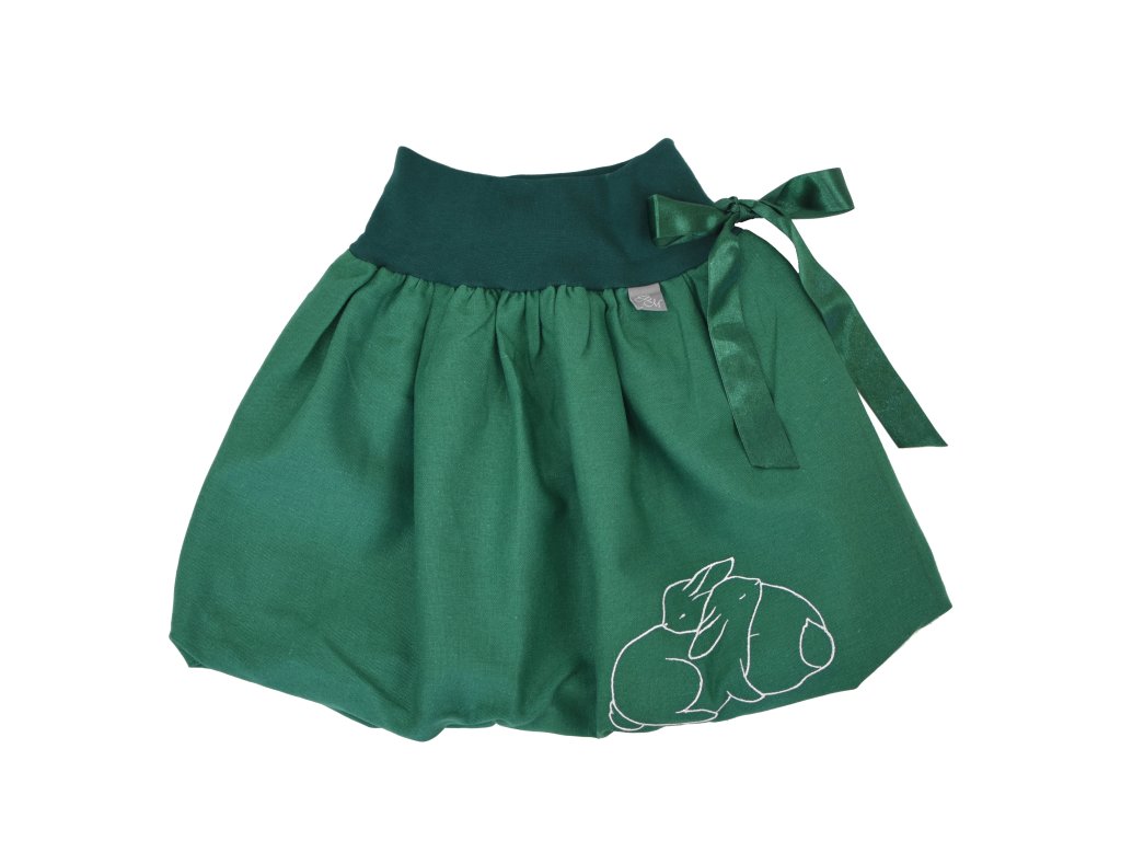 Dětská sukně balonového střihu s dvojitým elastickým pasovým okrajem. Podšité polyesterovou látkou, která je vhodná na punčošky i holé nohy. V pase je nechán otvor a jím protažená stuha, která pas stáhne a zároveň je zdobným prvkem… : ) S výšivkou králíčků.