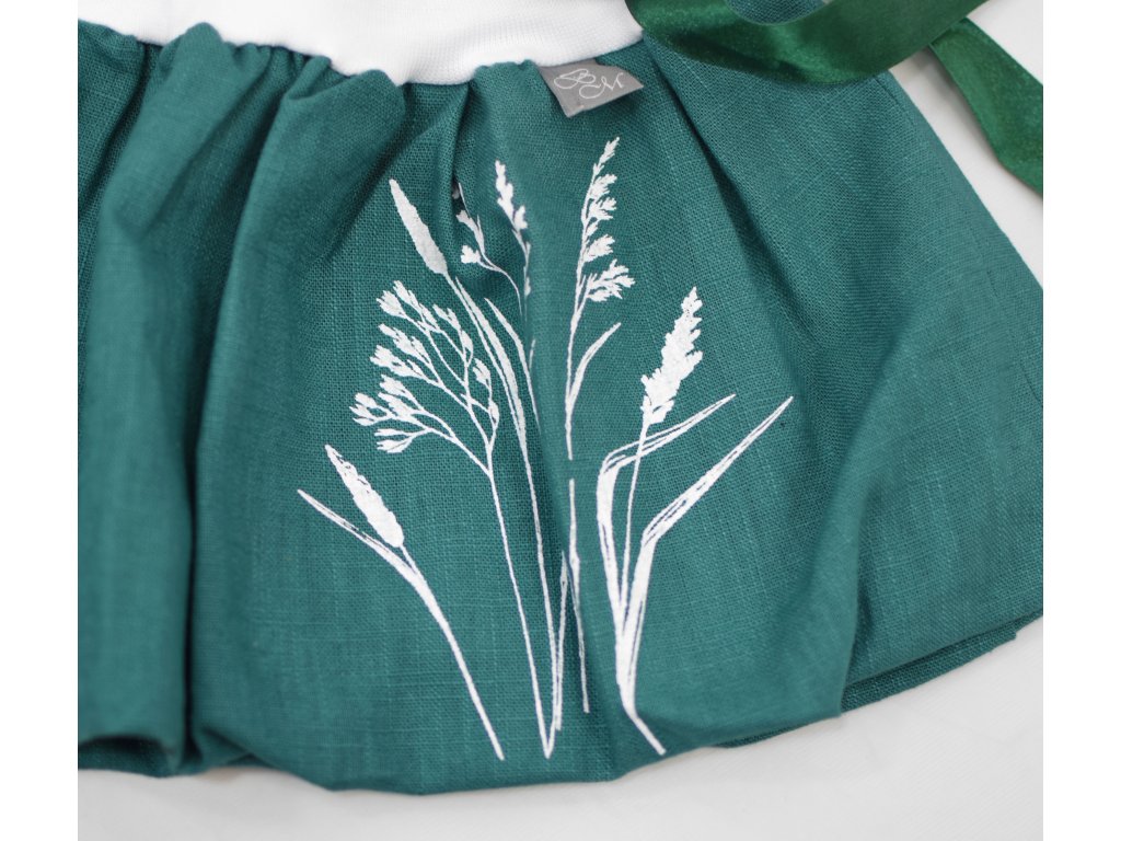 Dětská sukně balonového střihu s dvojitým elastickým pasovým okrajem. Podšité polyesterovou látkou, která je vhodná na punčošky i holé nohy. V pase je nechán otvor a jím protažená stuha, která pas stáhne a zároveň je zdobným prvkem… : ) Traviny tvořeny metodou sítotisku.