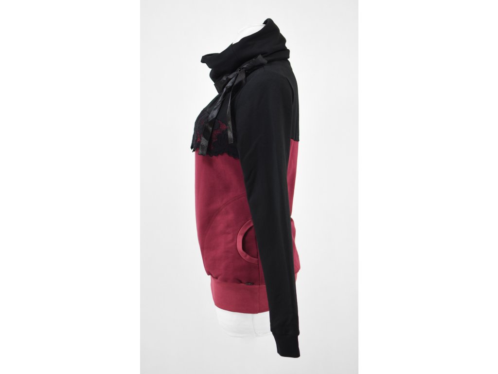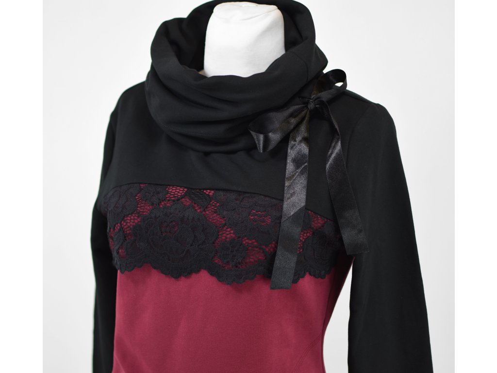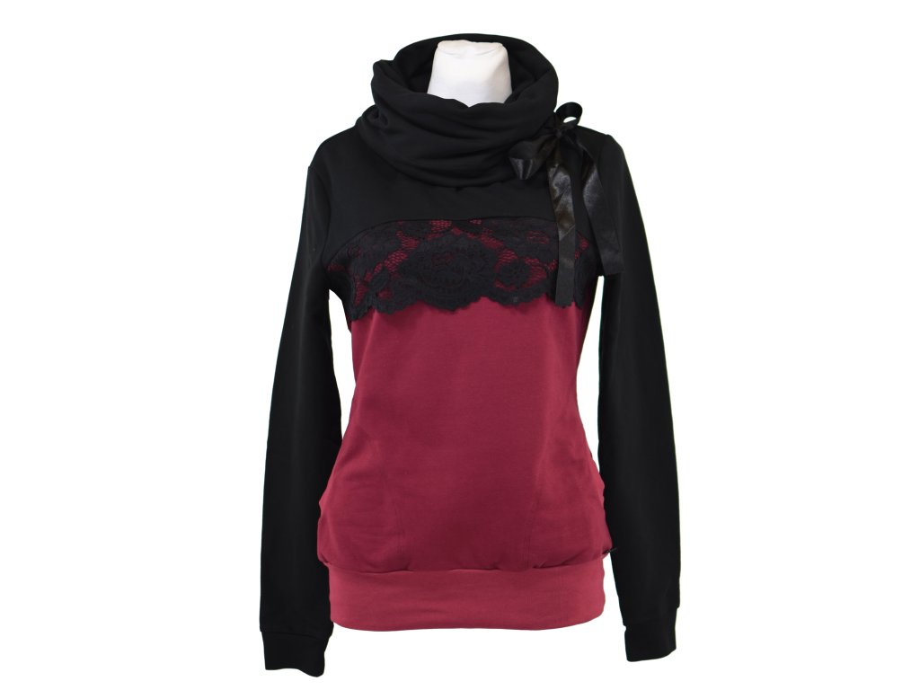Dámská mikina prodloužené délky a s prodlouženými rukávy. Rovnější v pase, kapsy v bocích jsou lemované úpletem a taktéž rukávy. Obří límec má z rubu otvor a je jím protažena stuha, kterou ho můžete stáhnout. Lze ho nosit ohrnutý. S krajkou na přední straně hrudníku.