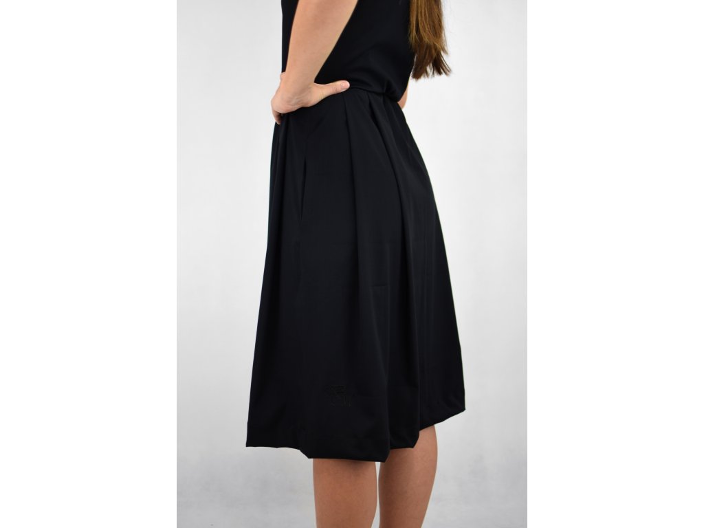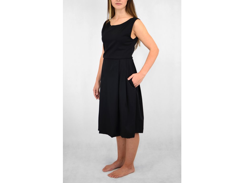 Dámské šaty mírně prodloužené délky s podkasáním v pase. Vrchní díl je volnější, ramínka mají zajímavý prvek překřížení. Sukně je široká a volná s osmi velkými sklady. Šaty mají skryté kapsy v bocích.