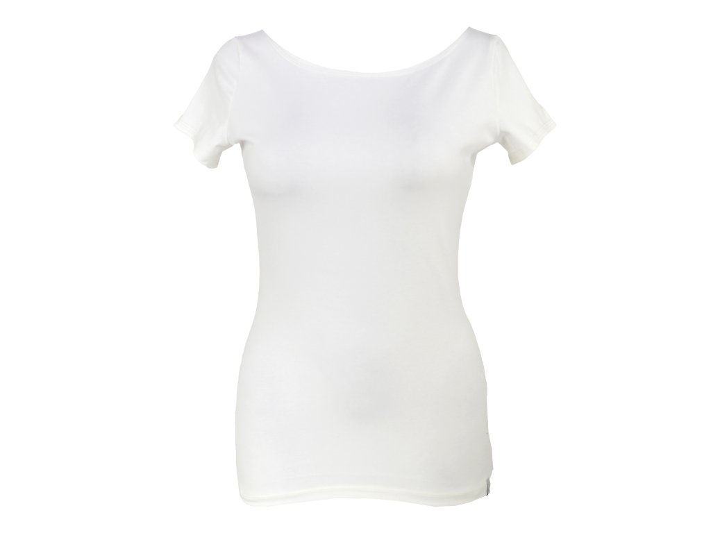 Dámské tričko z příjemného elastického úpletu. V pase projmuté, lodičkový výstřih.