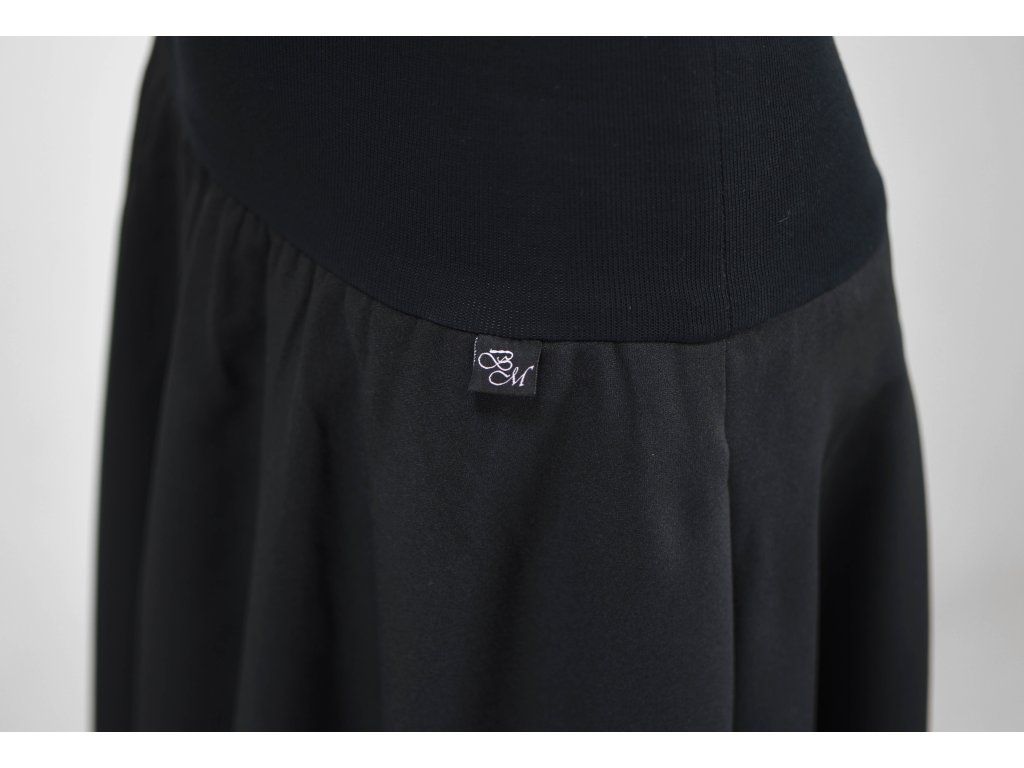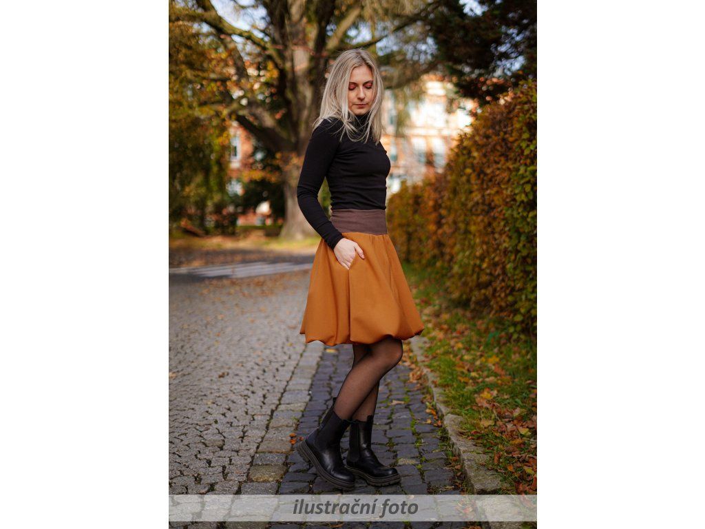 Dámská sukně balonového a půlkolového střihu zároveň. V pase s dvojitým elastickým okrajem vhodným pro většinu velikostí. Podšitá polyesterovou látkou, která je vhodná jak na punčochy, tak holé nohy a sukně se dá nosit celoročně. Z rubu elastického pasu je nechán otvor na případné vložení gumy na zpevnění či stažení pasu. Skryté kapsy v bocích nesmí chybět.