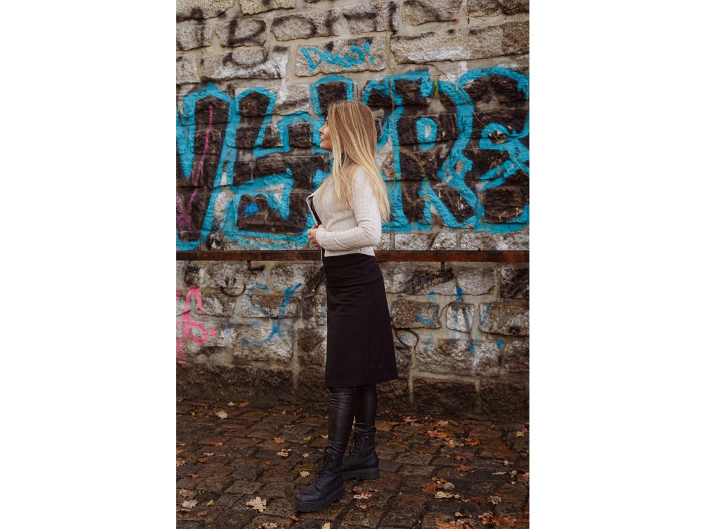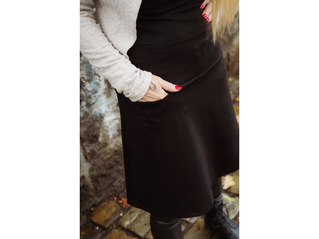 Dámská sukně áčkového střihu s kapsičkou. Zadní díl je lehce prodloužený. Vyšité logo BM v levém spodním rohu zadního dílu. Skvěle kombinovatelná jako komplet s našimi saky, ale lze ji nosit i jako volnočasovou. Nemá podšívku, dá se i tak nosit na punčochy i holé nohy.