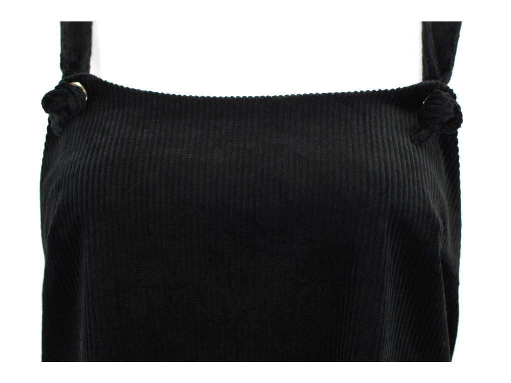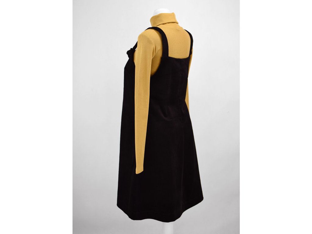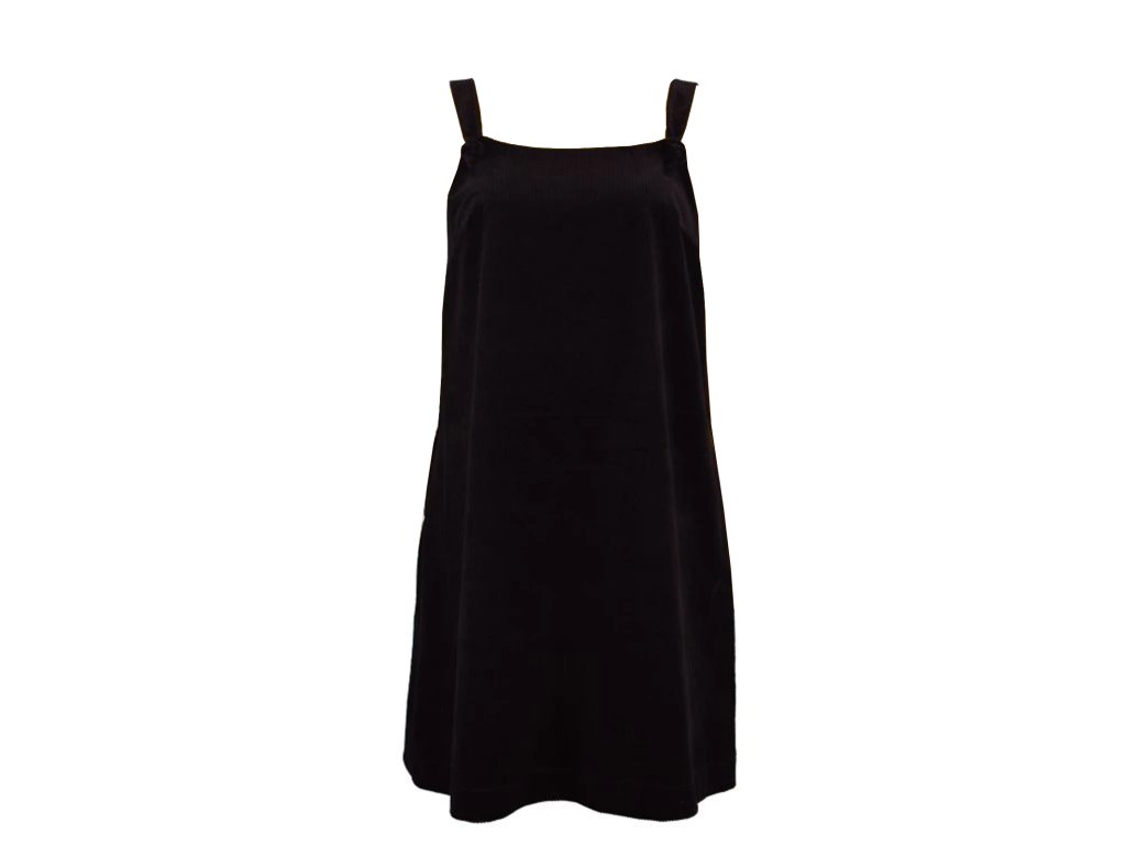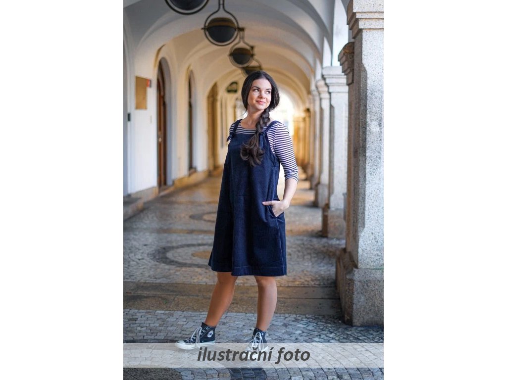 Dámské šaty s laclem. Na zádech jsou pruhy rovně, vepředu se protahují druky a zavážou podle potřeby. Jsou lehce tvarovány prsními záševky, jinak mají volný "áčkový" tvar. Mají dvě skryté kapsy v bocích.
