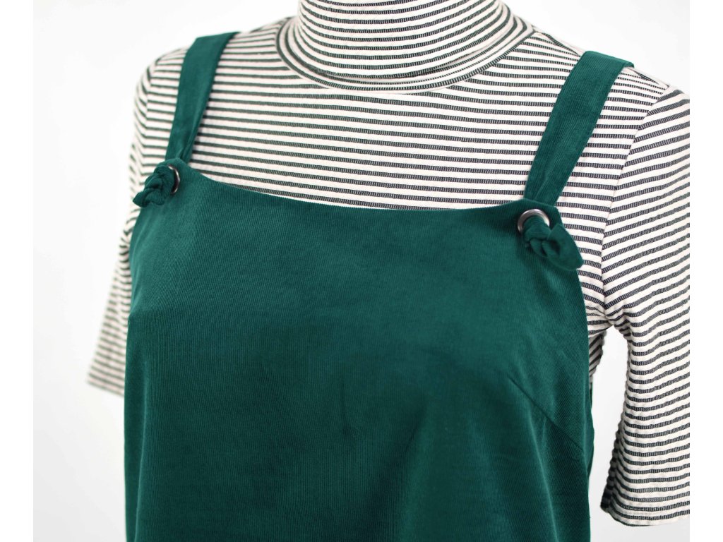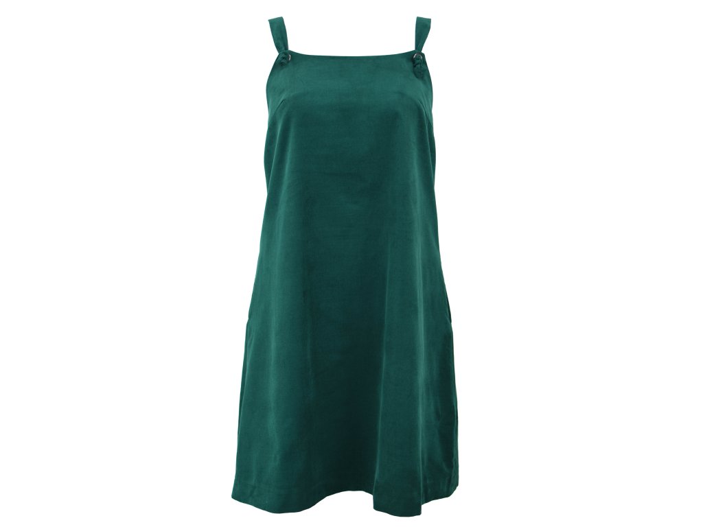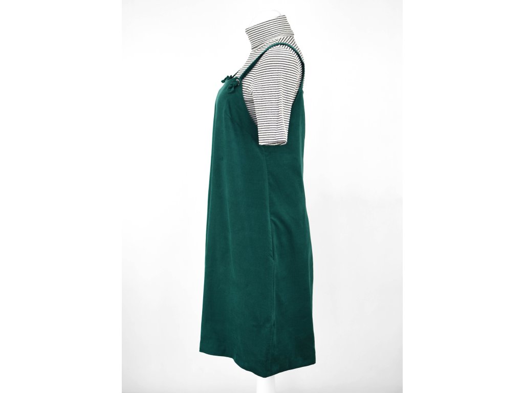 Dámské šaty s laclem. Na zádech jsou pruhy rovně, vepředu se protahují druky a zavážou podle potřeby. Jsou lehce tvarovány prsními záševky, jinak mají volný "áčkový" tvar. Mají dvě skryté kapsy v bocích.