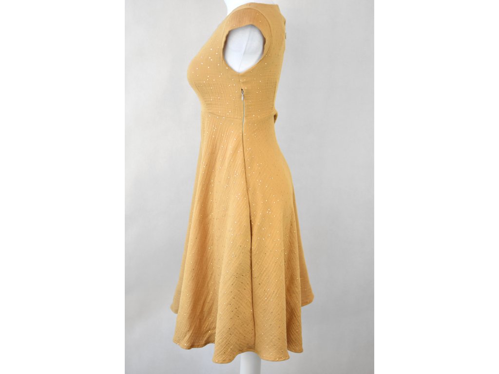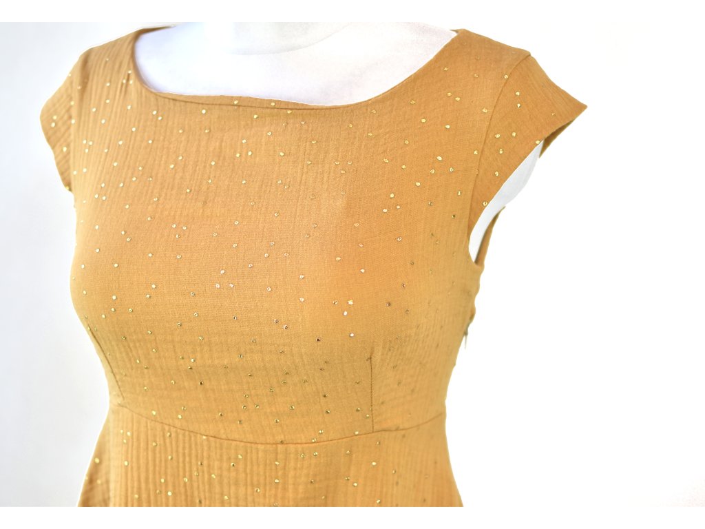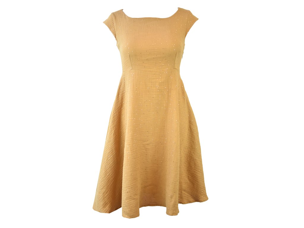 Půlkolové šaty VÍLA se zvýšeným pasem - světle hnědé a zlaté tečky