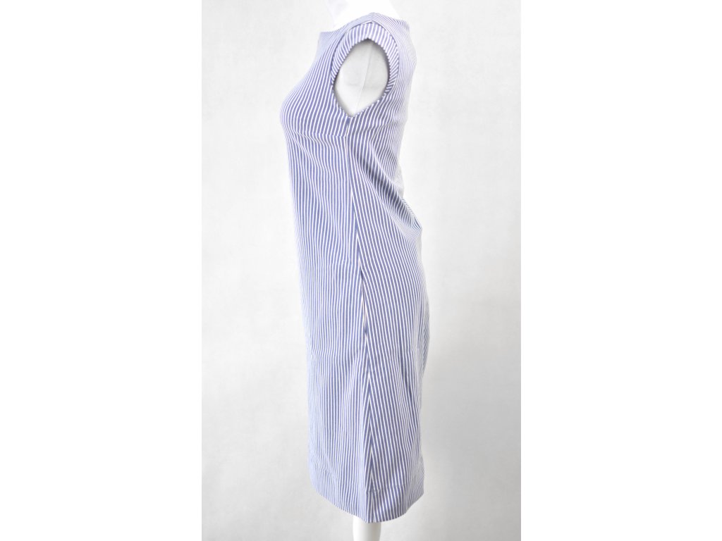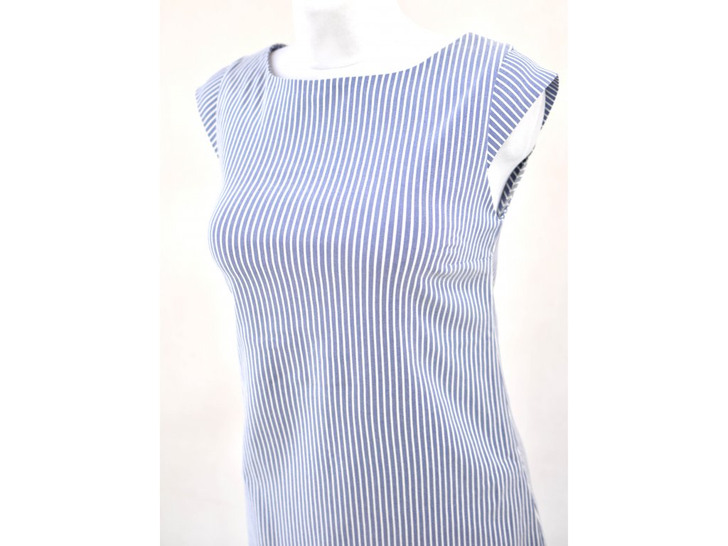 Dámské šaty z pevného materiálu. Tvarovány prsními záševky. Jednoduchá silueta do A. Dvě skryté kapsy v bocích. Vrchní díl podšitý podsádkou s krátkými zdvojenými rukávky. Volnější střih pro pohodlnější nošení.