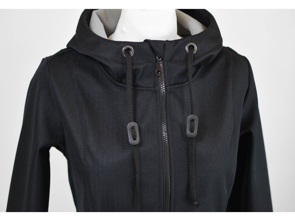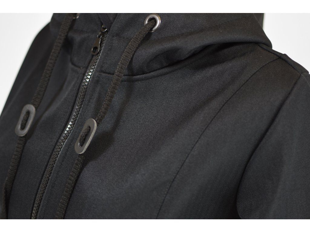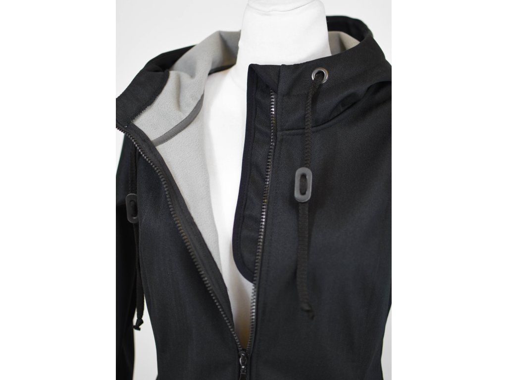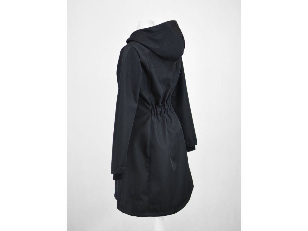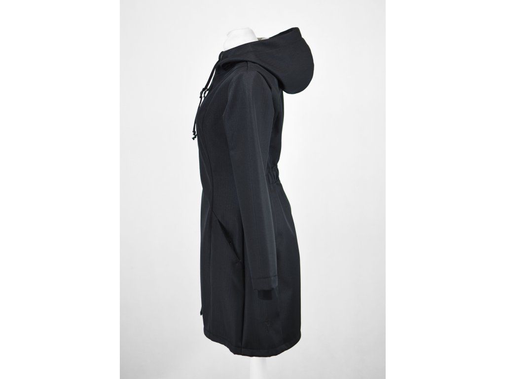 Dámský softshellový kabát áčkového střihu. Střih je projmutý do pasu, zadní díl je stažený do pevně všité gumy. V horní části je úzký, postupně se rozšiřuje. V dolním okraji se dá stáhnout gumičkou na obou stranách. Zadní délka je delší než přední část. Kabátek má oboucestný zip, kapsy na zip - všité na předním díle.
