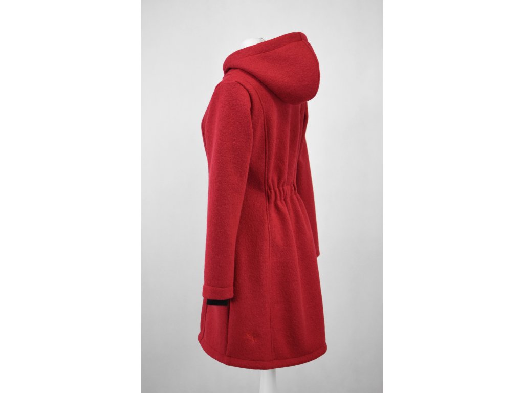 Dámský vlněný kabát áčkového střihu. Střih je projmutý do pasu, zadní díl je stažený do pevně všité gumy. V horní části je úzký, postupně se rozšiřuje. V dolním okraji se dá stáhnout gumičkou na obou stranách. Zadní délka je delší než přední část. Je kompletně vypodšívkovaný.