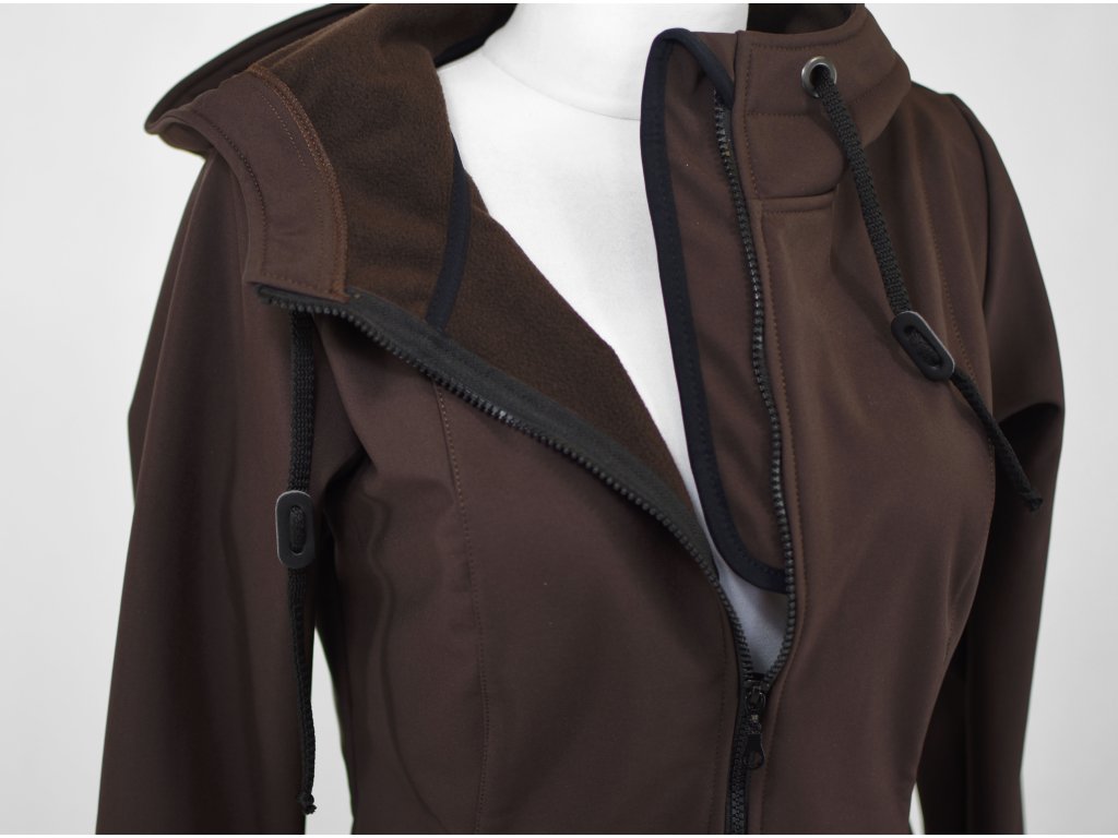 Dámský softshellový kabát áčkového střihu. Střih je projmutý do pasu, zadní díl je stažený do pevně všité gumy. V horní části je úzký, postupně se rozšiřuje. V dolním okraji se dá stáhnout gumičkou na obou stranách. Zadní délka je delší než přední část. Kabátek má oboucestný zip, kapsy na zip - všité na předním díle.