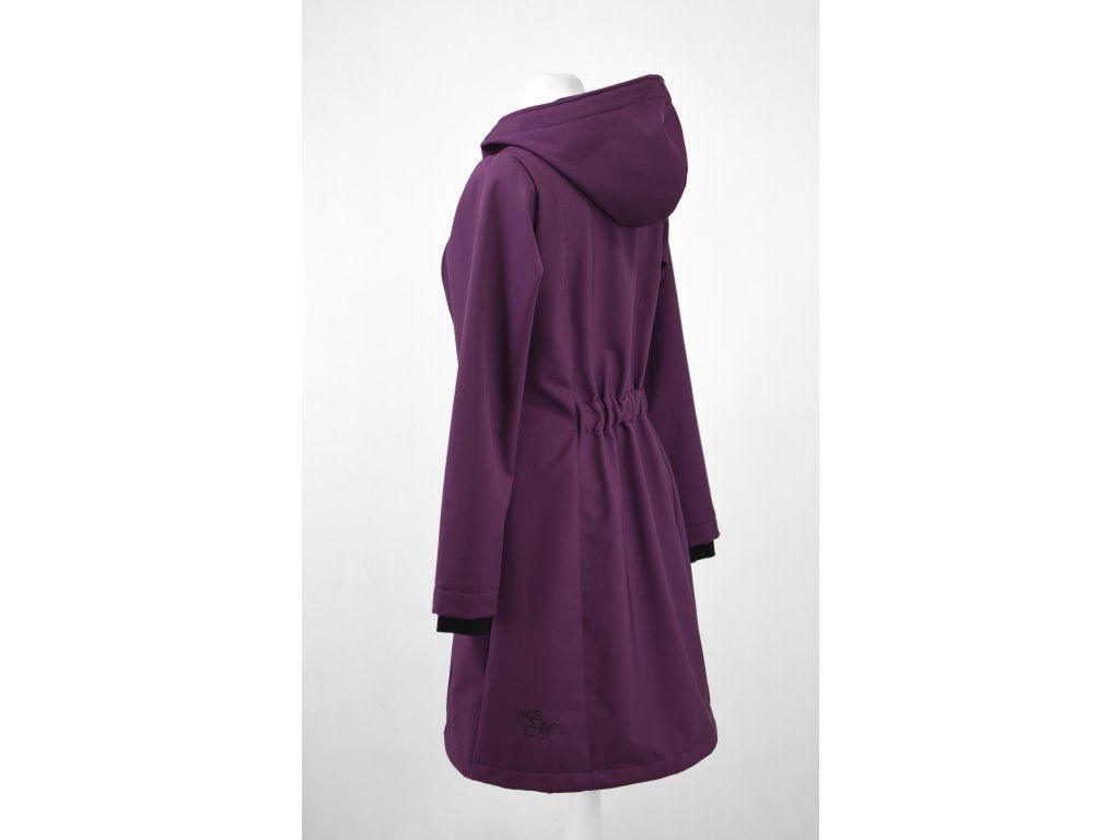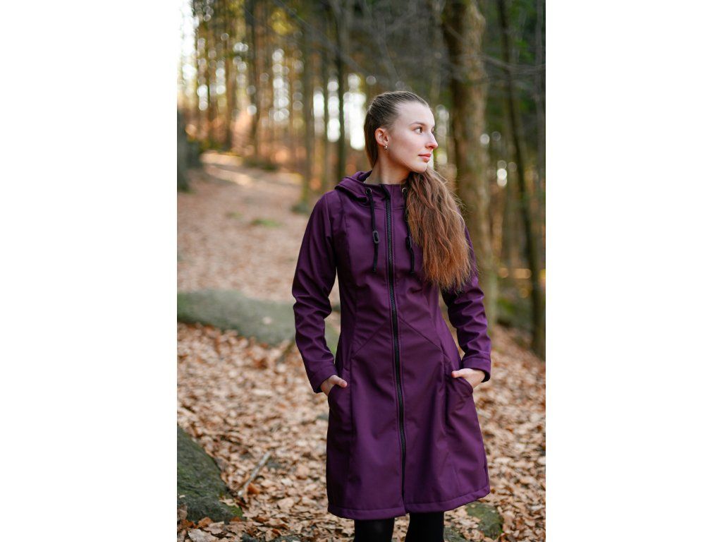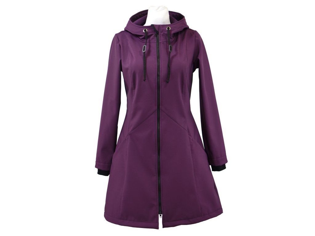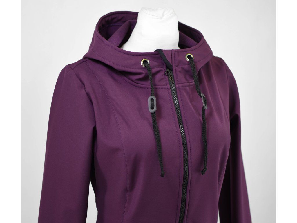 Dámský softshellový kabát áčkového střihu. Střih je projmutý do pasu, zadní díl je stažený do pevně všité gumy. V horní části je užší a postupně se rozšiřuje. Zadní délka je delší než přední část. Kabátek má oboustranný zip, kapsy na zip všité na předním díle a neodmyslitelnou součástí je také chránič brady u zipu. V dolním okraji se dá stáhnout gumičkou na obou stranách.
