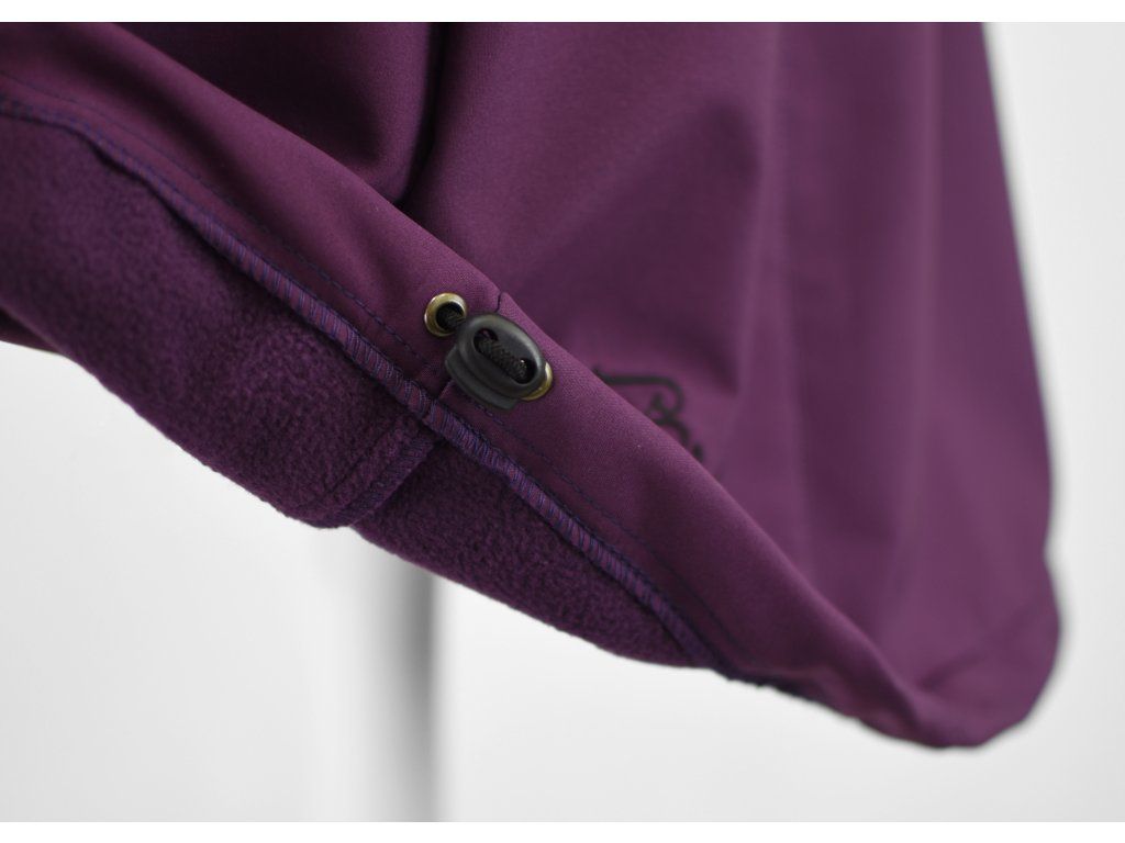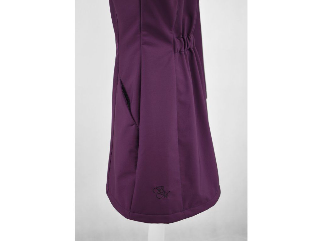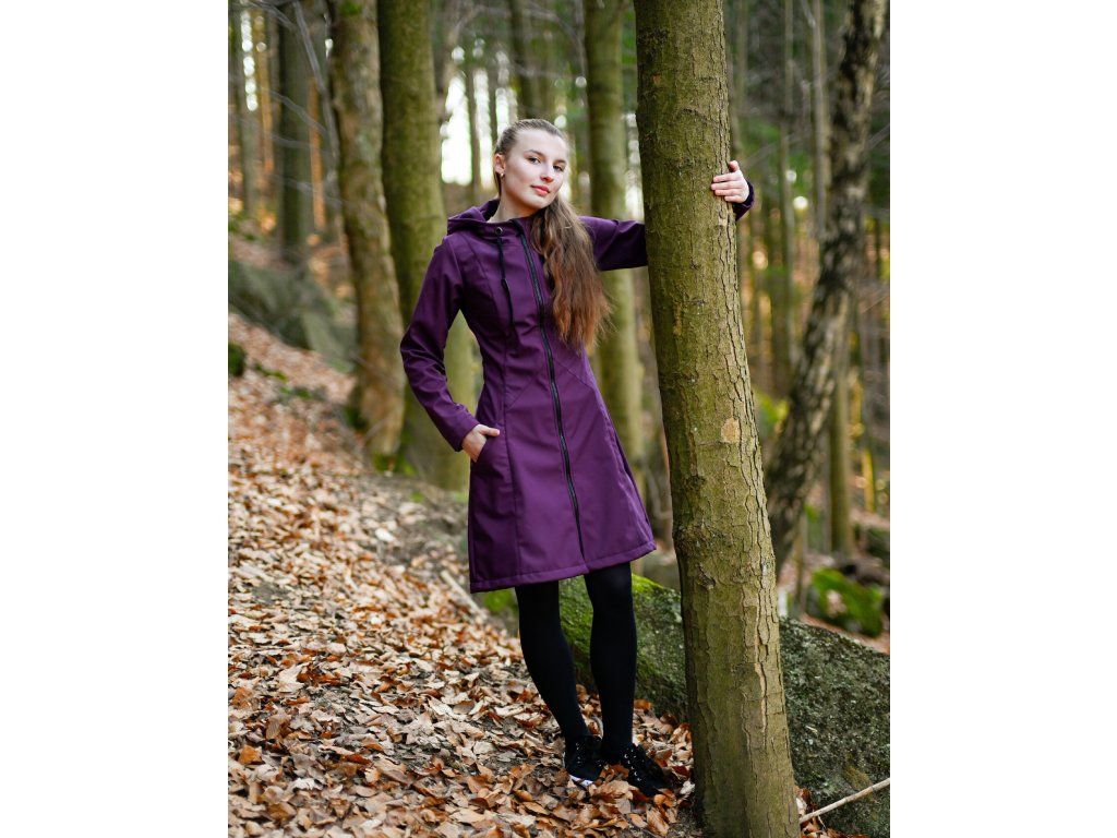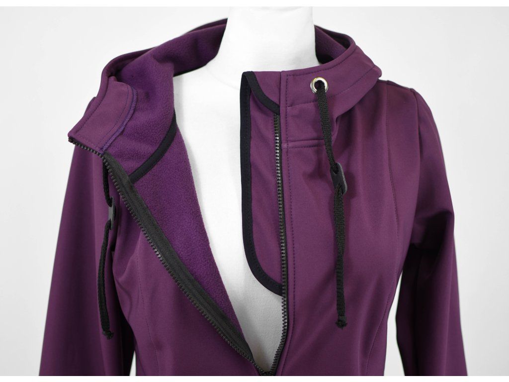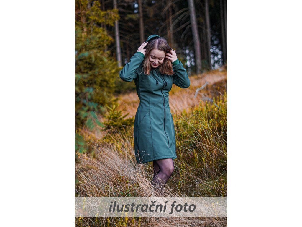 Dámský softshellový kabát áčkového střihu. Střih je projmutý do pasu, zadní díl je stažený do pevně všité gumy. V horní části je užší a postupně se rozšiřuje. Zadní délka je delší než přední část. Kabátek má oboustranný zip, kapsy na zip všité na předním díle a neodmyslitelnou součástí je také chránič brady u zipu. V dolním okraji se dá stáhnout gumičkou na obou stranách.