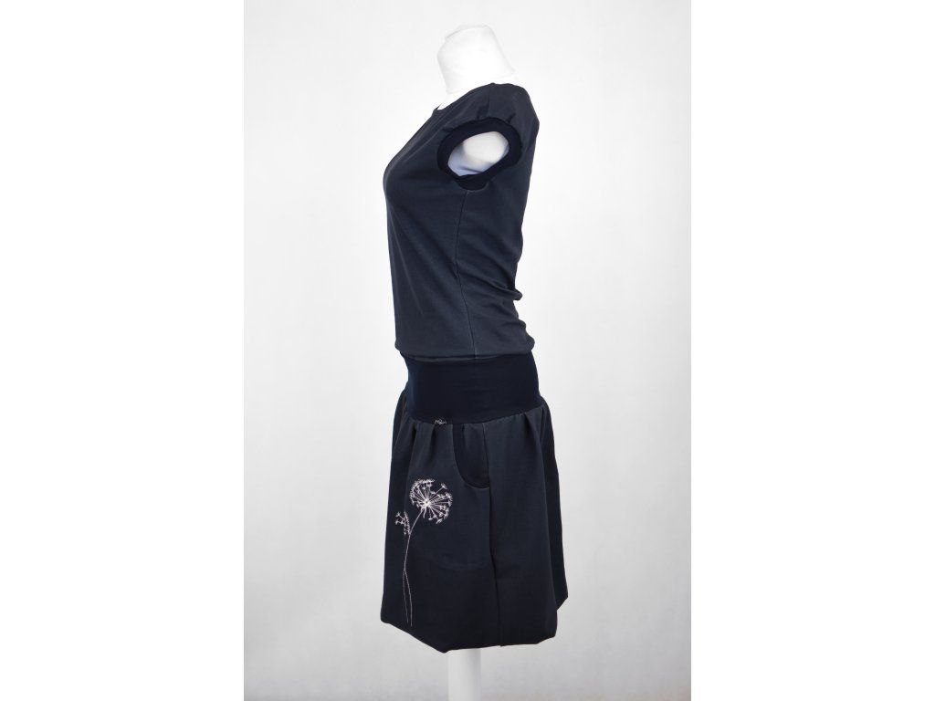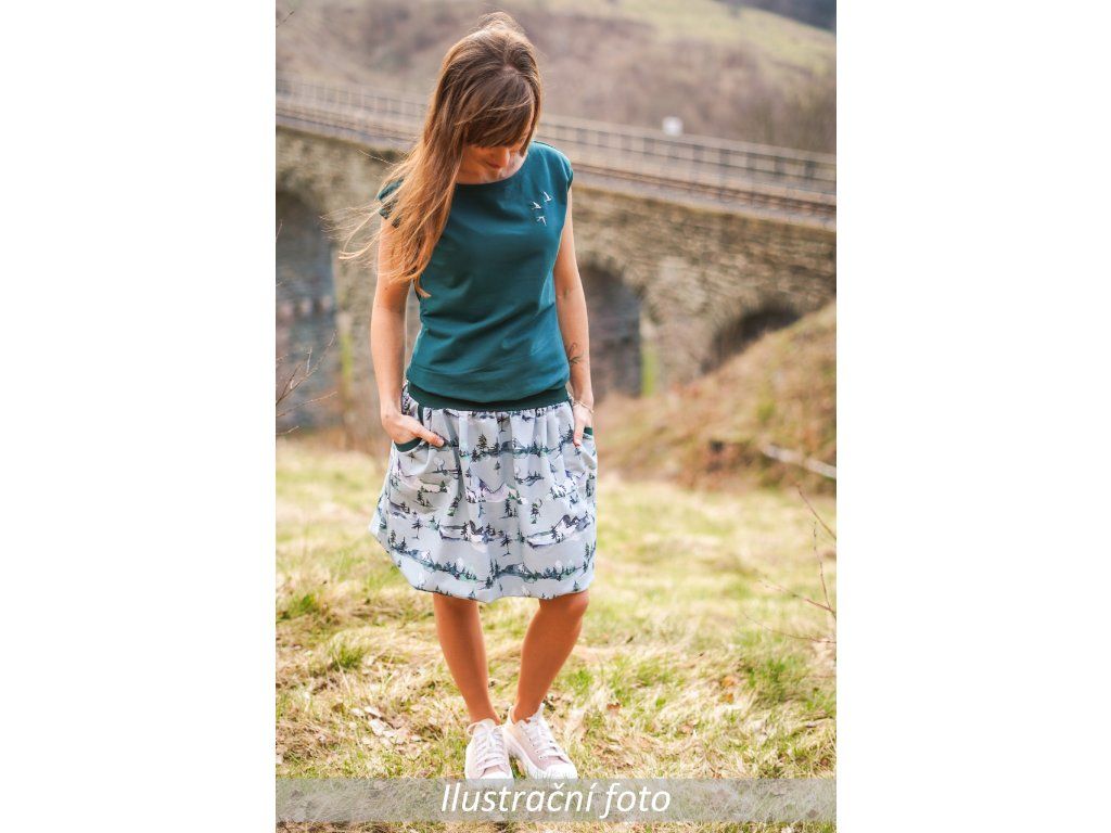 Dámská šatovka přestřižená v bocích ve variantě s nápletem, stažené gumičkou. Sukně je vypodšívkovaná s kapsami v bocích, průramky lemované úpletem. Dá se nosit samotná bez rukávů, anebo s tričkem.. :)