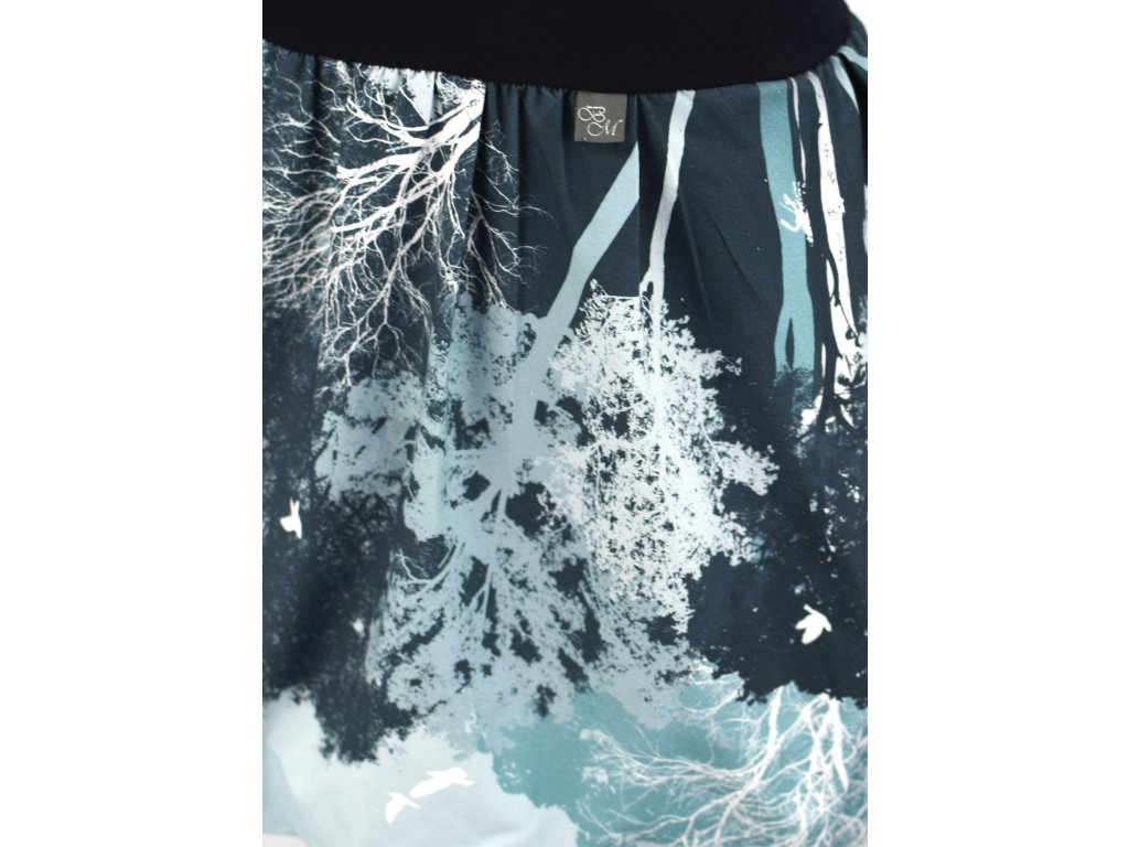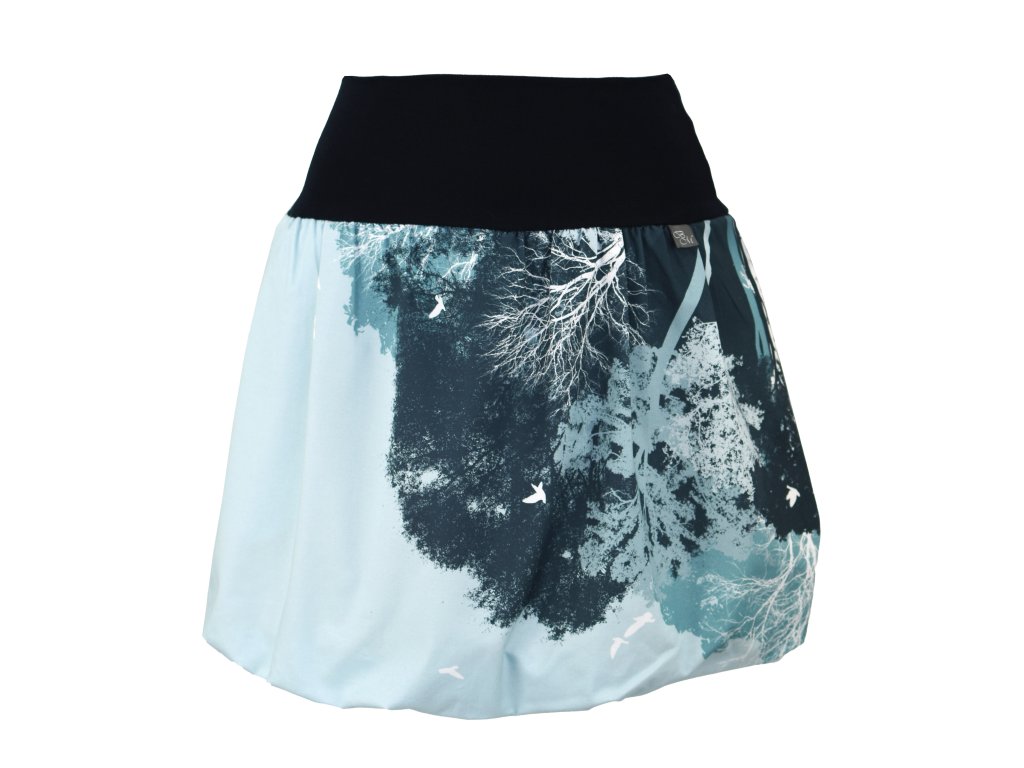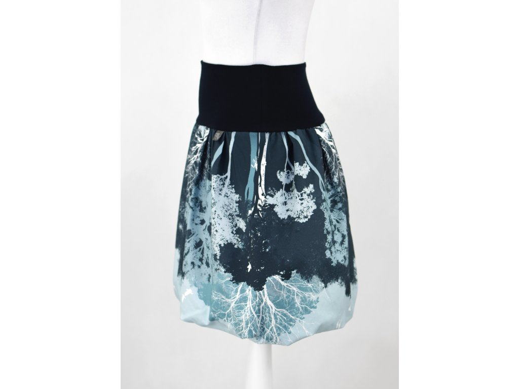 Dámská sukně balonového střihu s dvojitým elastickým pasovým okrajem vhodným pro většinu velikostí. Podšité polyesterovou látkou, která je vhodná jak na punčochy, tak holé nohy a sukně se dá nosit celoročně. Z rubu elastického pasu je nechán otvor na případné vložení gumy na zpevnění či stažení pasu – vhodné pro velikost XS.