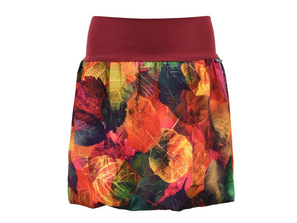 Dámská sukně balonového střihu s dvojitým elastickým pasovým okrajem vhodným pro většinu velikostí. Podšité polyesterovou látkou, která je vhodná jak na punčochy, tak holé nohy a sukně se dá nosit celoročně. Z rubu elastického pasu je nechán otvor na případné vložení gumy na zpevnění či stažení pasu – vhodné pro velikost XS.