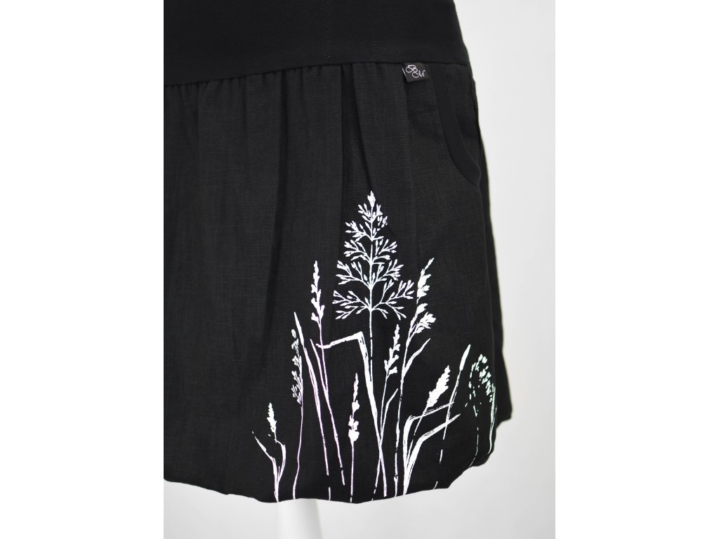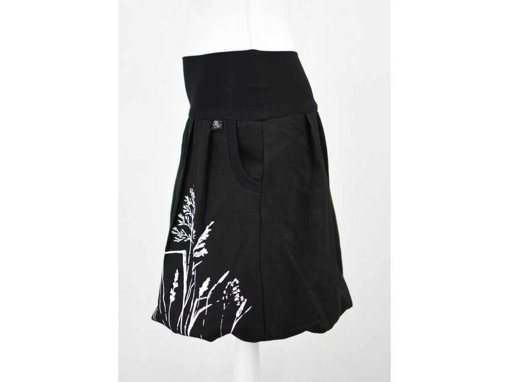Dámská sukně balonového střihu s dvojitým elastickým pasovým okrajem vhodným pro většinu velikostí. Podšité polyesterovou látkou, která je vhodná jak na punčochy, tak holé nohy a sukně se dá nosit celoročně. Z rubu elastického pasu je nechán otvor na případné vložení gumy na zpevnění či stažení pasu – vhodné pro velikost XS. Traviny jsou tvořeny metodou sítotisku.