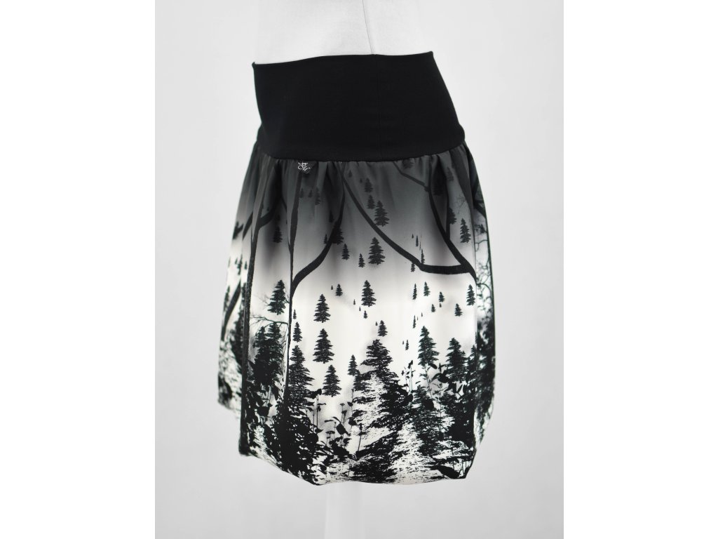 Dámská sukně balonového střihu s dvojitým elastickým pasovým okrajem vhodným pro většinu velikostí. Podšité polyesterovou látkou, která je vhodná jak na punčochy, tak holé nohy a sukně se dá nosit celoročně. Z rubu elastického pasu je nechán otvor na případné vložení gumy na zpevnění či stažení pasu – vhodné pro velikost XS.