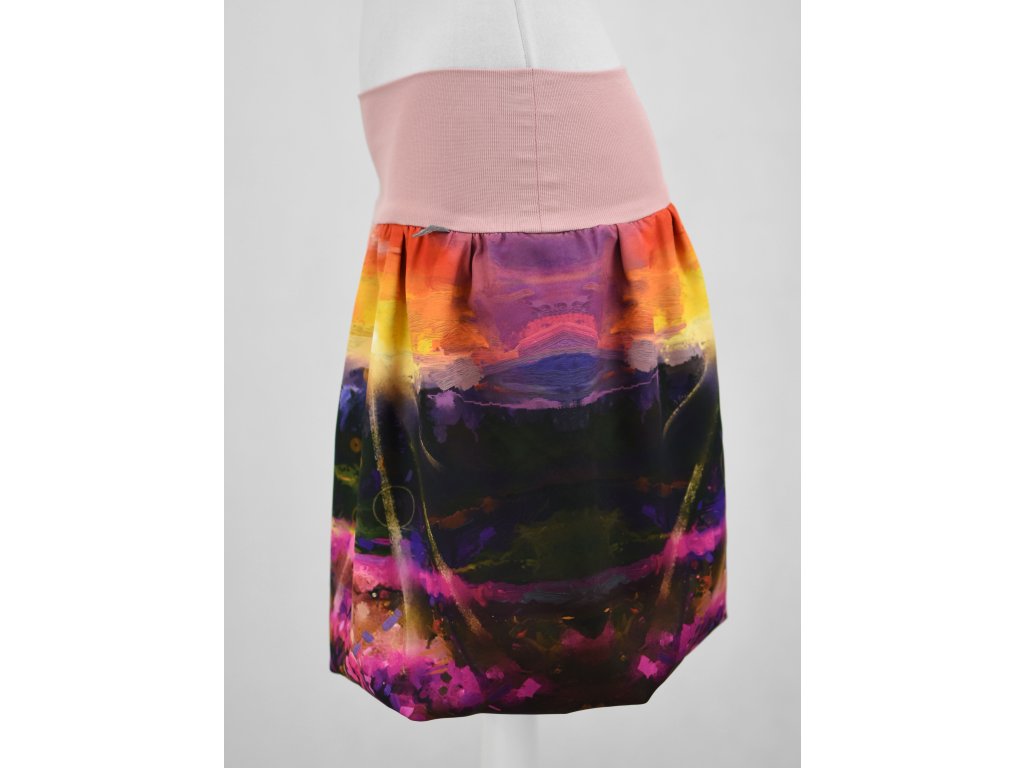 Dámská sukně balonového střihu s dvojitým elastickým pasovým okrajem vhodným pro většinu velikostí. Podšité polyesterovou látkou, která je vhodná jak na punčochy, tak holé nohy a sukně se dá nosit celoročně. Z rubu elastického pasu je nechán otvor na případné vložení gumy na zpevnění či stažení pasu – vhodné pro velikost XS.
