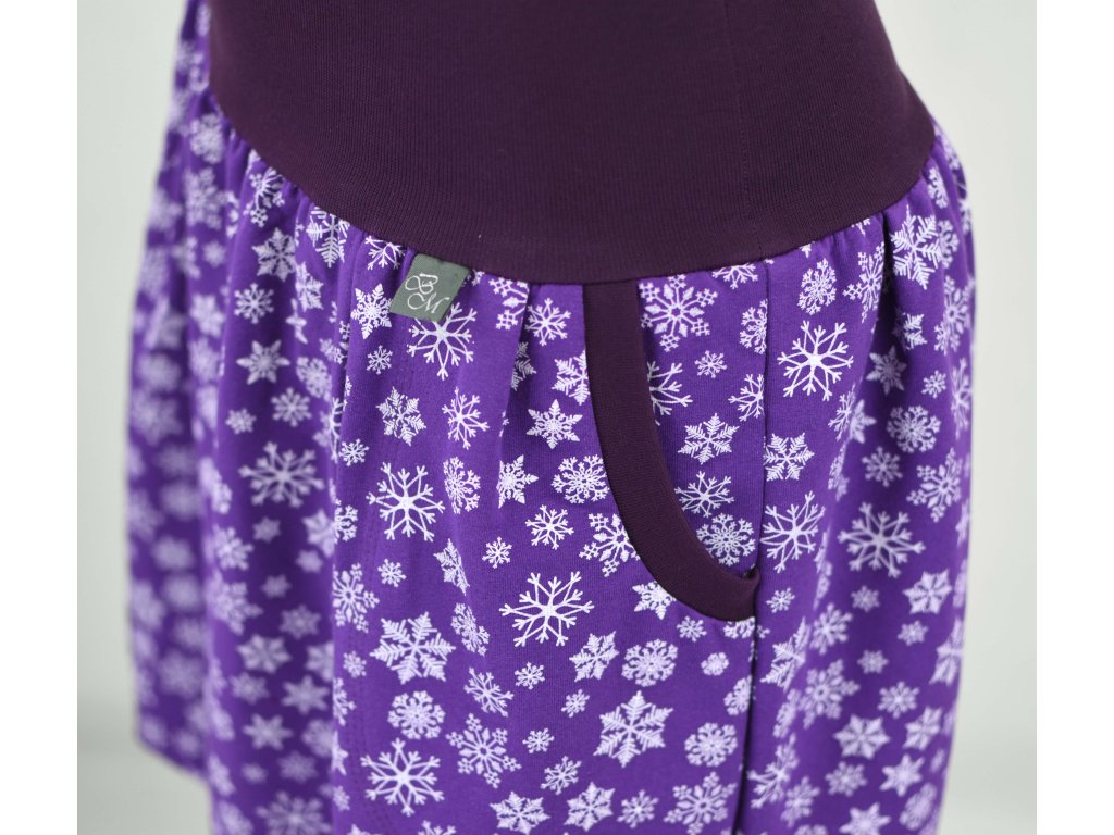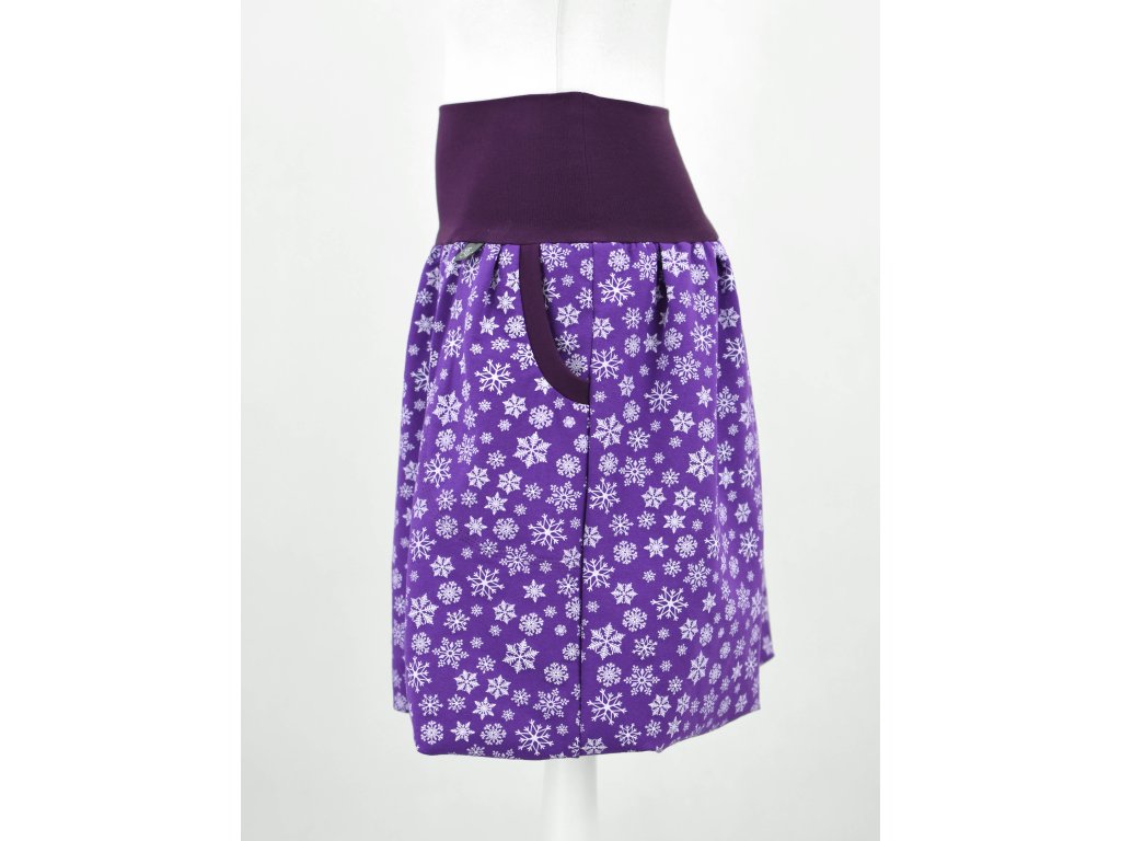 Dámská sukně balonového střihu s dvojitým elastickým pasovým okrajem vhodným pro většinu velikostí. Podšité polyesterovou látkou, která je vhodná jak na punčochy, tak holé nohy a sukně se dá nosit celoročně. Z rubu elastického pasu je nechán otvor na případné vložení gumy na zpevnění či stažení pasu – vhodné pro velikost XS. Látka zdobená potiskem vloček.