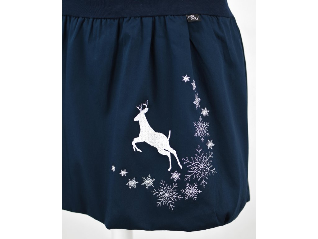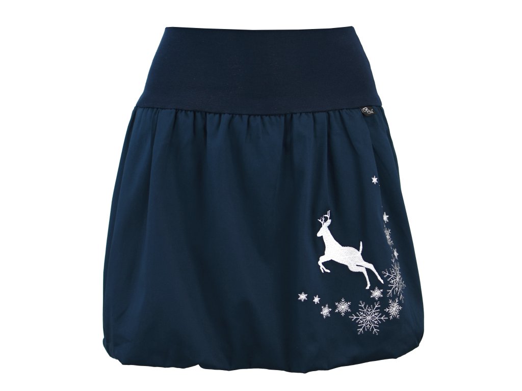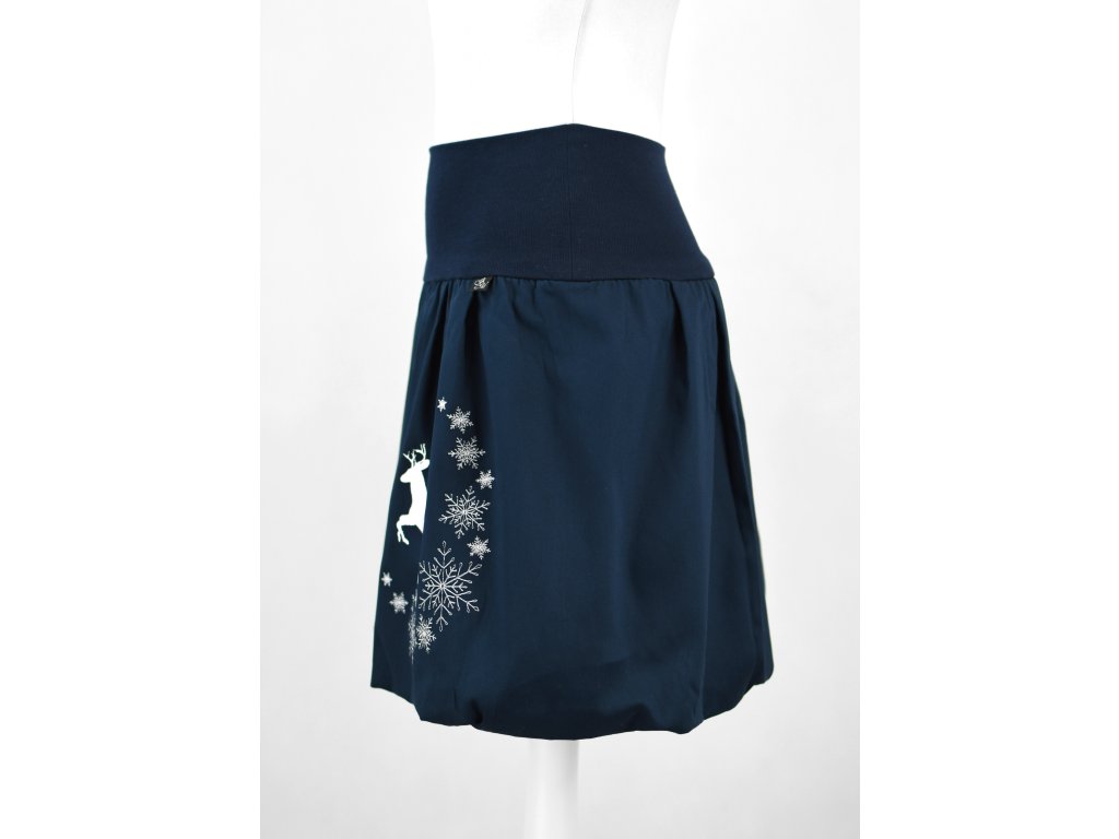 Dámská sukně balonového střihu s dvojitým elastickým pasovým okrajem vhodným pro většinu velikostí. Podšité polyesterovou látkou, která je vhodná jak na punčochy, tak holé nohy a sukně se dá nosit celoročně. Z rubu elastického pasu je nechán otvor na případné vložení gumy na zpevnění či stažení pasu – vhodné pro velikost XS.