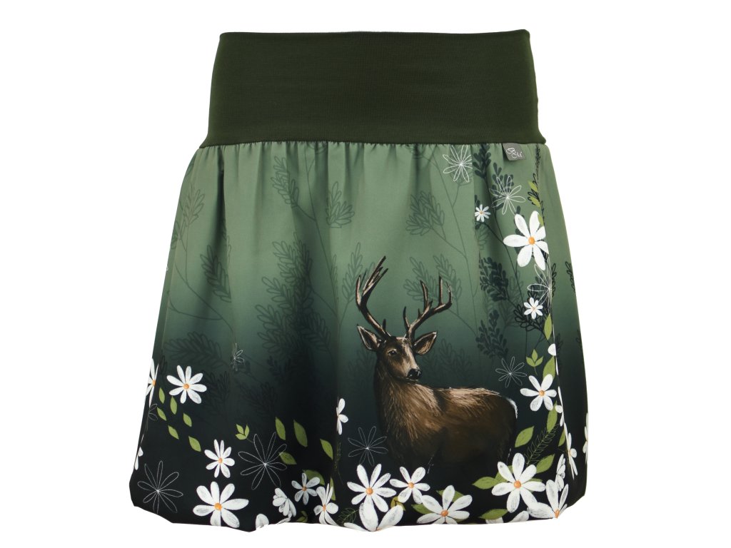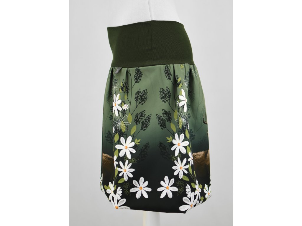 Dámská sukně balonového střihu s dvojitým elastickým pasovým okrajem vhodným pro většinu velikostí. Podšité polyesterovou látkou, která je vhodná jak na punčochy, tak holé nohy a sukně se dá nosit celoročně. Z rubu elastického pasu je nechán otvor na případné vložení gumy na zpevnění či stažení pasu – vhodné pro velikost XS.