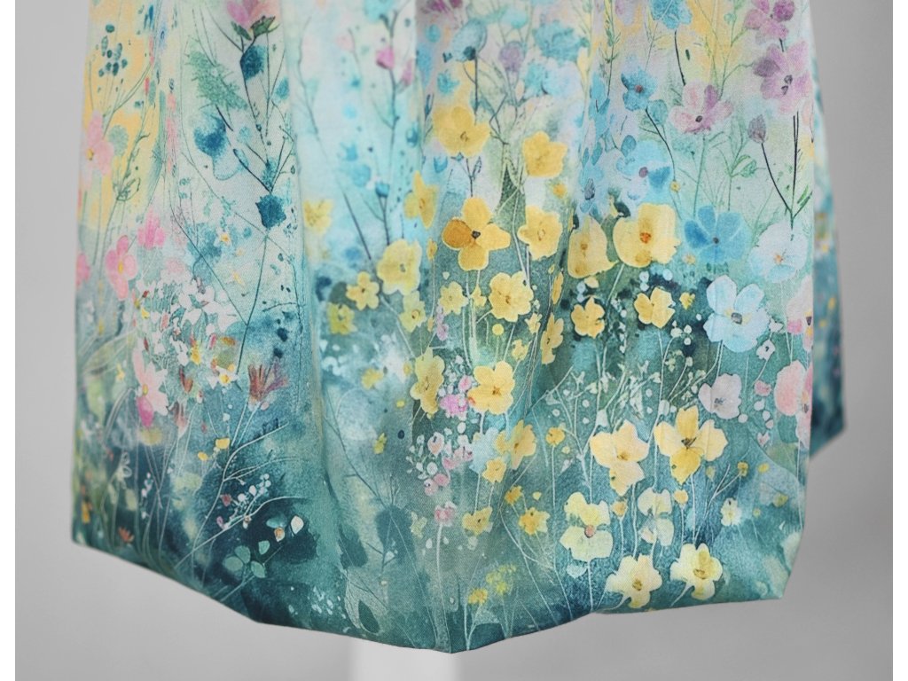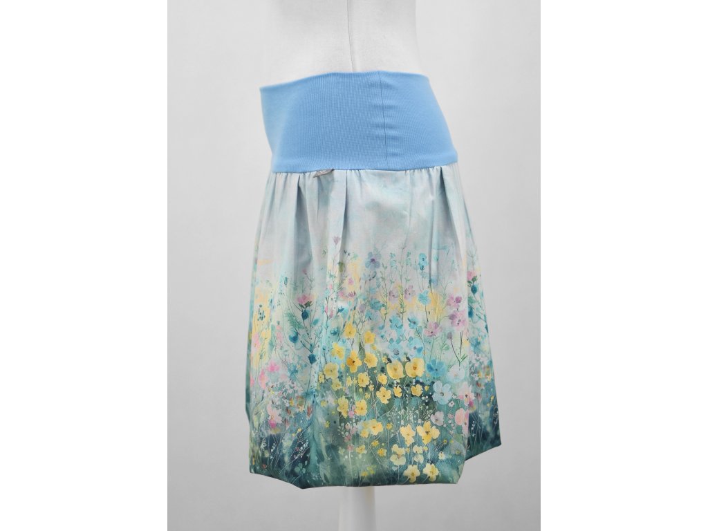 Dámská sukně balonového střihu s dvojitým elastickým pasovým okrajem vhodným pro většinu velikostí. Podšité polyesterovou látkou, která je vhodná jak na punčochy, tak holé nohy a sukně se dá nosit celoročně. Z rubu elastického pasu je nechán otvor na případné vložení gumy na zpevnění či stažení pasu – vhodné pro velikost XS.
