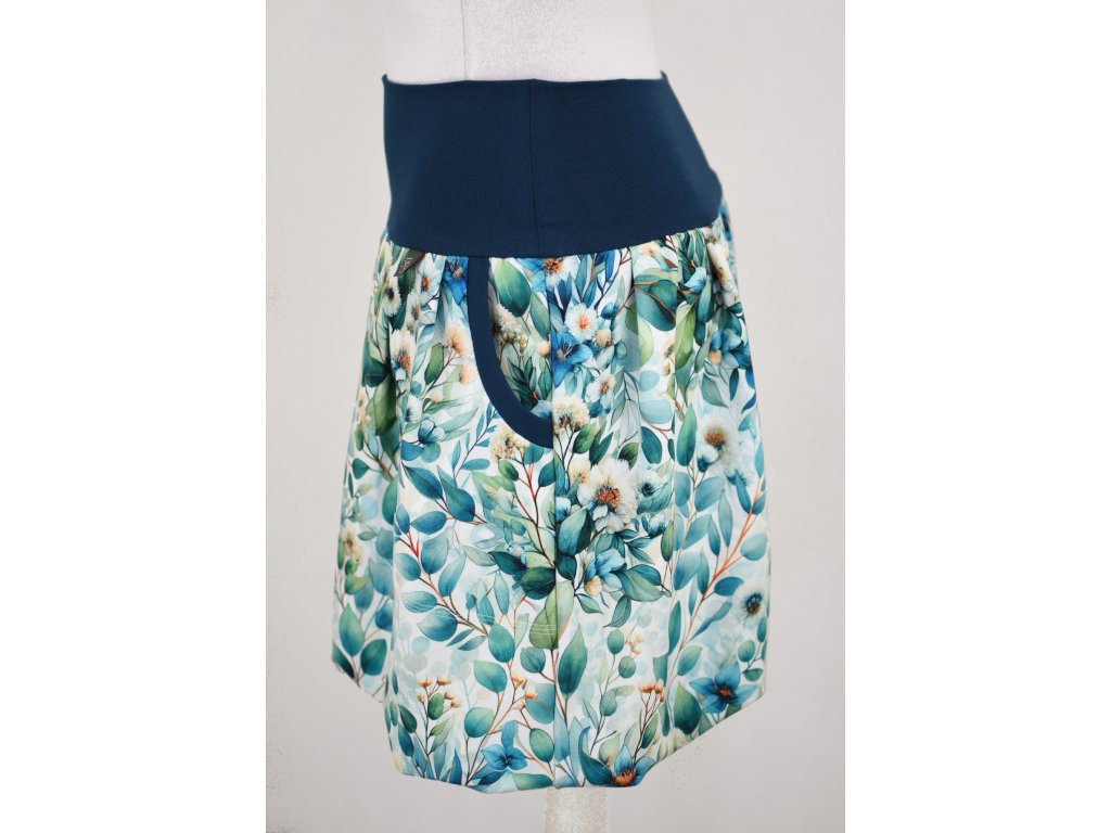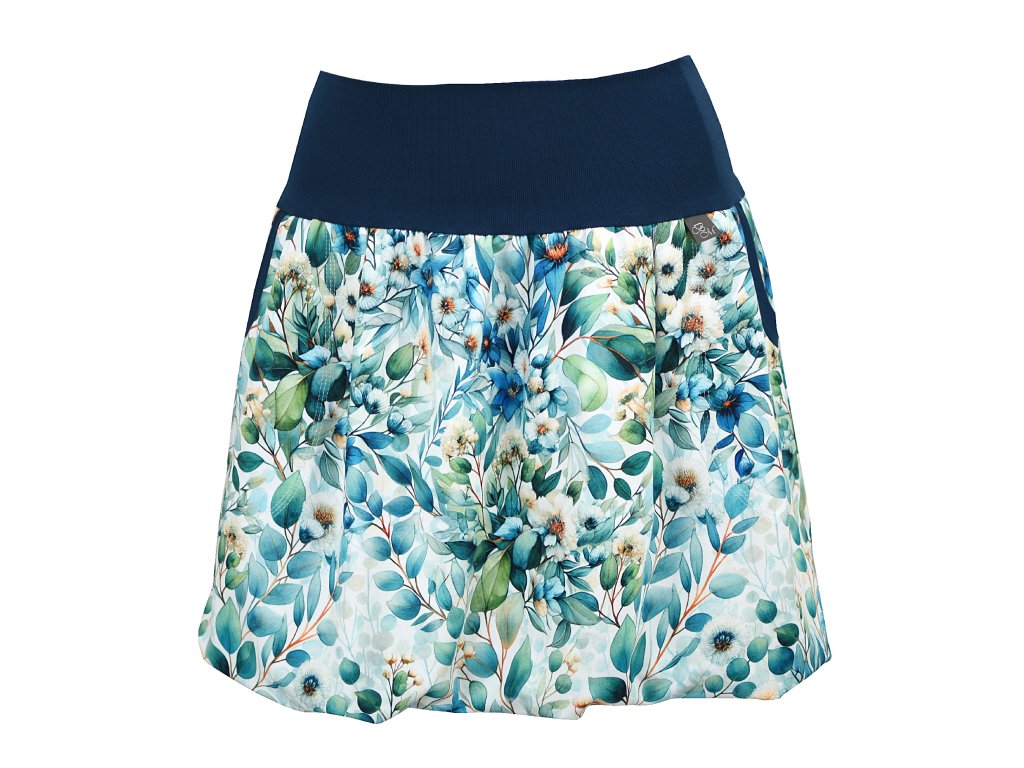 Dámská sukně balonového střihu s dvojitým elastickým pasovým okrajem vhodným pro většinu velikostí. Podšité polyesterovou látkou, která je vhodná jak na punčochy, tak holé nohy a sukně se dá nosit celoročně. Z rubu elastického pasu je nechán otvor na případné vložení gumy na zpevnění či stažení pasu – vhodné pro velikost XS.