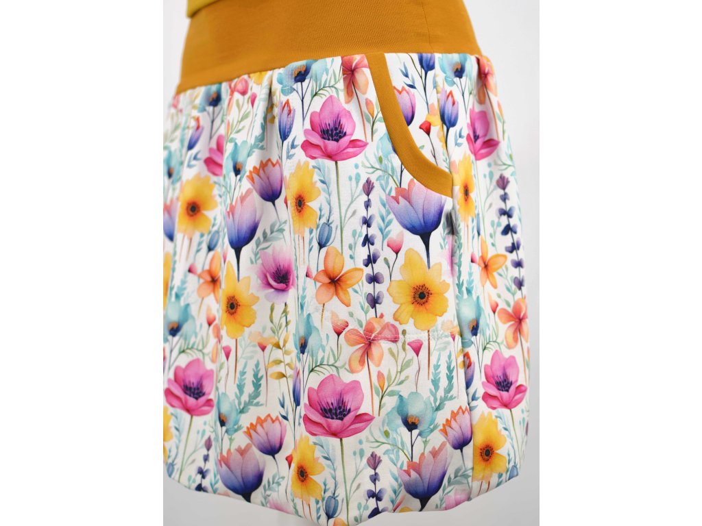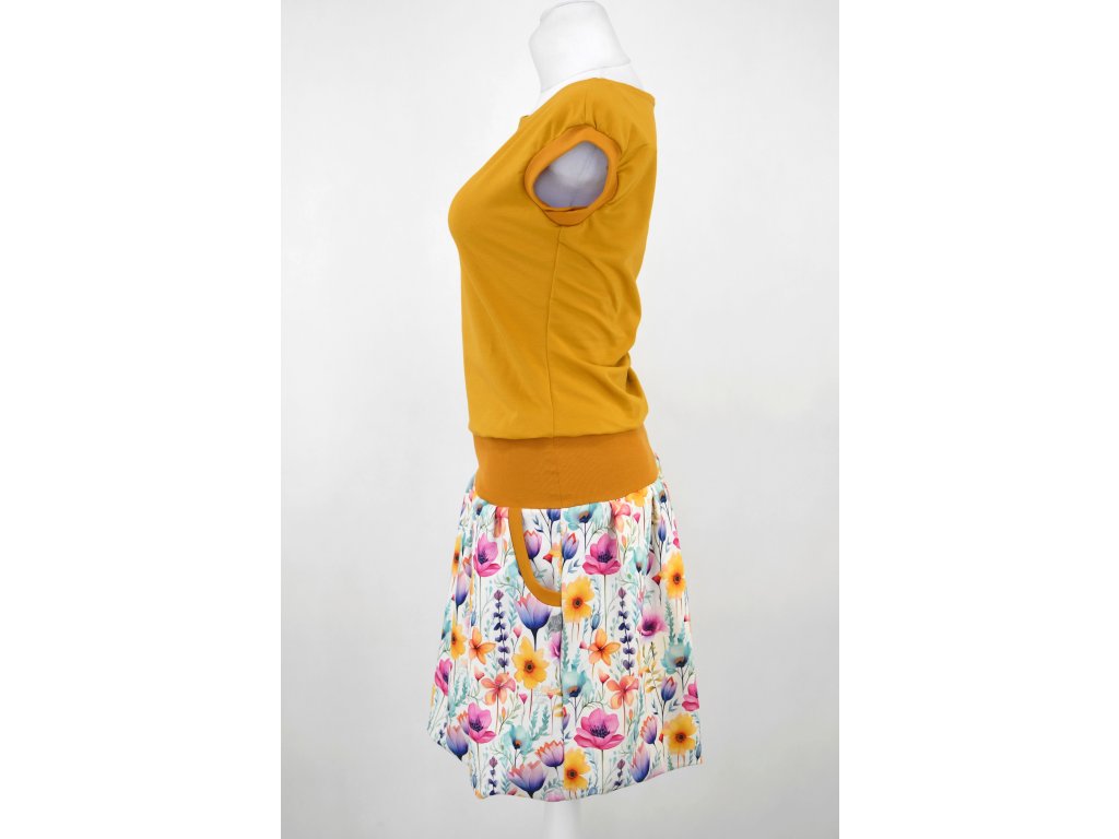 Dámská šatovka přestřižená v bocích s pasovým nápletem, šatovka se tak dá podkasat. Sukně je vypodšívkovaná s kapsami v bocích, průramky lemované úpletem.