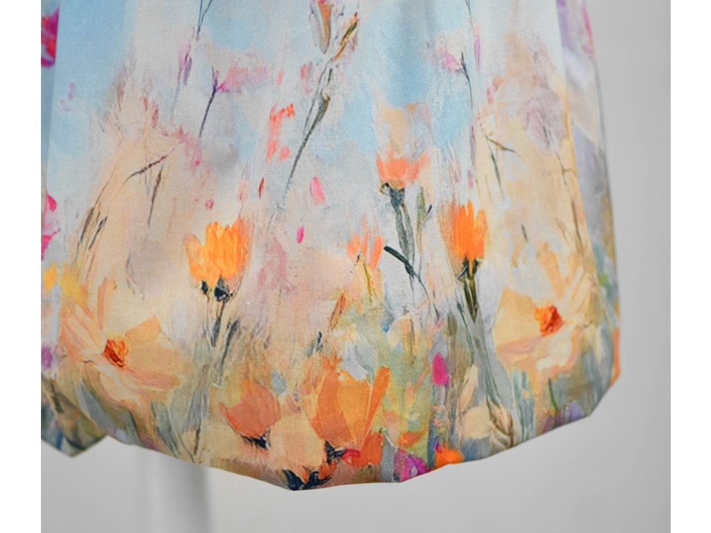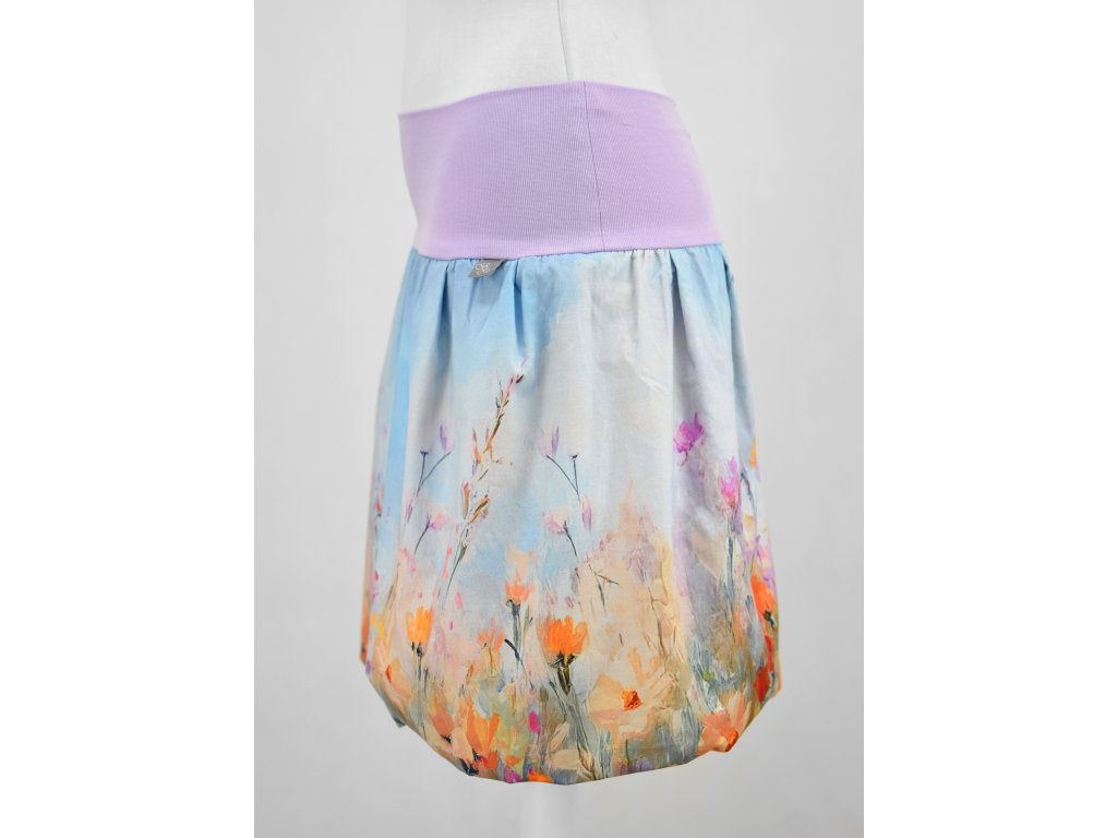 Dámská sukně balonového střihu s dvojitým elastickým pasovým okrajem vhodným pro většinu velikostí. Podšité polyesterovou látkou, která je vhodná jak na punčochy, tak holé nohy a sukně se dá nosit celoročně. Z rubu elastického pasu je nechán otvor na případné vložení gumy na zpevnění či stažení pasu – vhodné pro velikost XS.