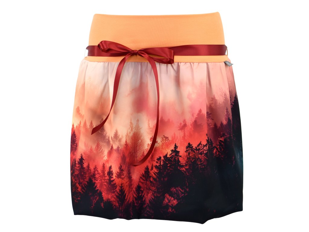 Dámská sukně balonového střihu s dvojitým elastickým pasovým okrajem vhodným pro většinu velikostí. Podšité polyesterovou látkou, která je vhodná jak na punčochy, tak holé nohy a sukně se dá nosit celoročně. Z rubu elastického pasu je nechán otvor na případné vložení gumy na zpevnění či stažení pasu – vhodné pro velikost XS. Sukně má 2 očka na stuhu, dají se případně lehce odstranit.