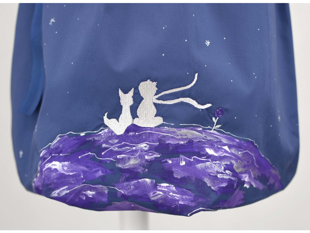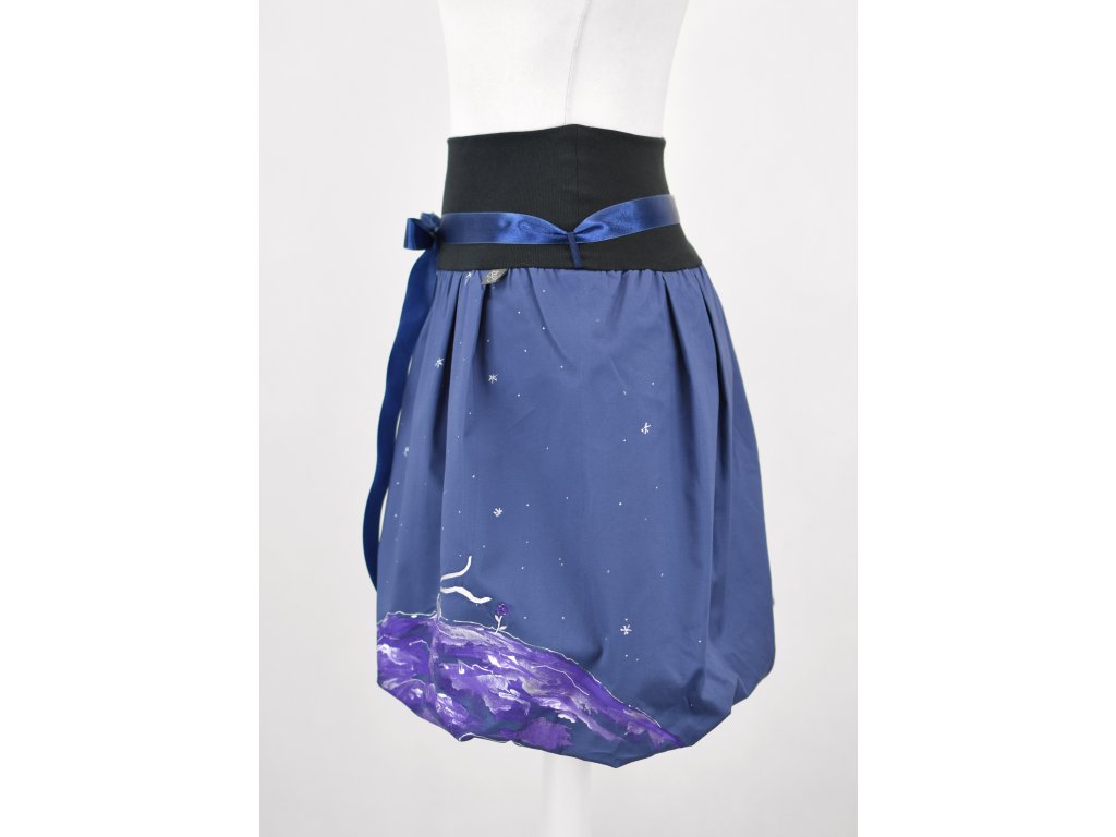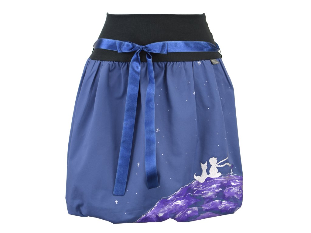 Dámská sukně balonového střihu s dvojitým elastickým pasovým okrajem vhodným pro většinu velikostí. Podšité polyesterovou látkou, která je vhodná jak na punčochy, tak holé nohy a sukně se dá nosit celoročně. Z rubu elastického pasu je nechán otvor na případné vložení gumy na zpevnění či stažení pasu – vhodné pro velikost XS.