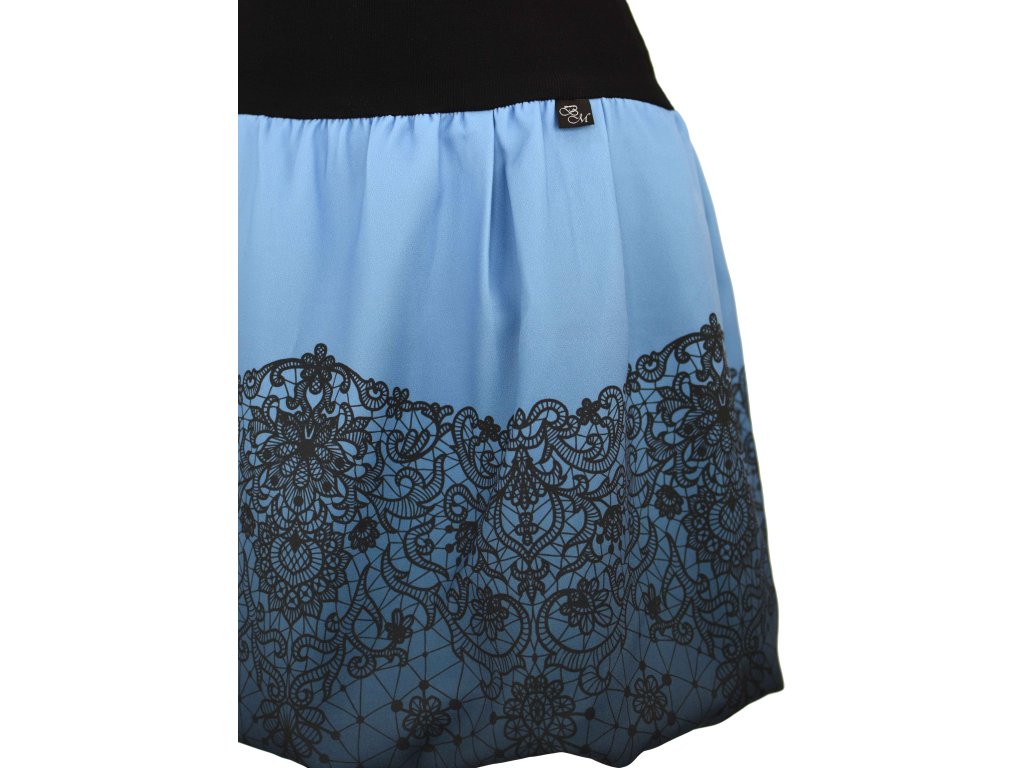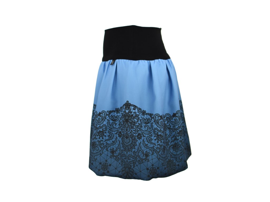 Dámská sukně balonového střihu s dvojitým elastickým pasovým okrajem vhodným pro většinu velikostí. Podšité polyesterovou látkou, která je vhodná jak na punčochy, tak holé nohy a sukně se dá nosit celoročně. Z rubu elastického pasu je nechán otvor na případné vložení gumy na zpevnění či stažení pasu – vhodné pro velikost XS.