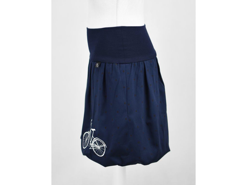 Dámská sukně balonového střihu s dvojitým elastickým pasovým okrajem vhodným pro většinu velikostí. Podšité polyesterovou látkou, která je vhodná jak na punčochy, tak holé nohy a sukně se dá nosit celoročně. Z rubu elastického pasu je nechán otvor na případné vložení gumy na zpevnění či stažení pasu – vhodné pro velikost XS.