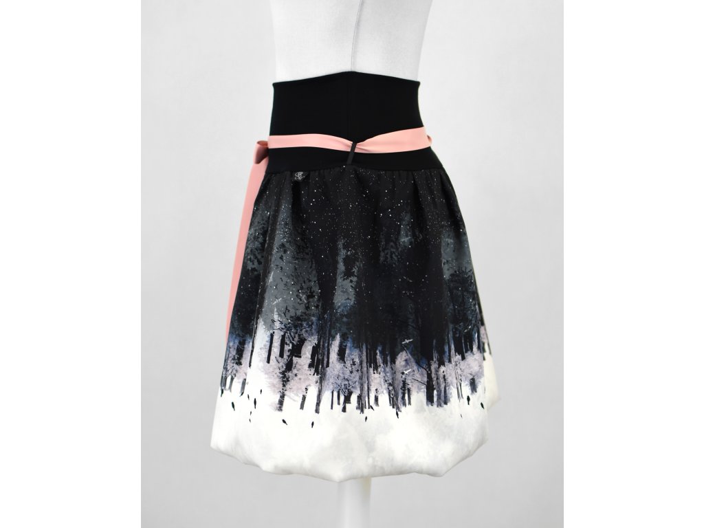 Dámská sukně balonového střihu s dvojitým elastickým pasovým okrajem vhodným pro většinu velikostí. Podšité polyesterovou látkou, která je vhodná jak na punčochy, tak holé nohy a sukně se dá nosit celoročně. Z rubu elastického pasu je nechán otvor na případné vložení gumy na zpevnění či stažení pasu – vhodné pro velikost XS.