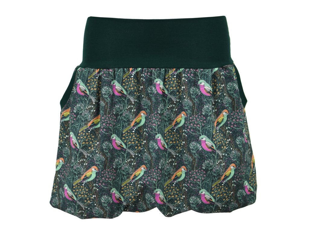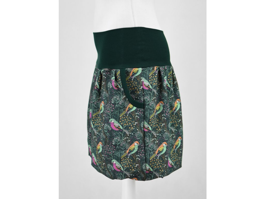 Dámská sukně balonového střihu s dvojitým elastickým pasovým okrajem vhodným pro většinu velikostí. Podšité polyesterovou látkou, která je vhodná jak na punčochy, tak holé nohy a sukně se dá nosit celoročně. Z rubu elastického pasu je nechán otvor na případné vložení gumy na zpevnění či stažení pasu – vhodné pro velikost XS.