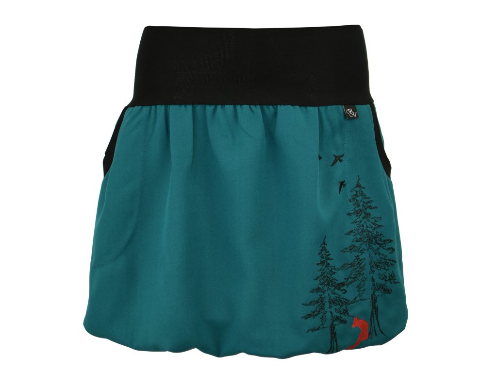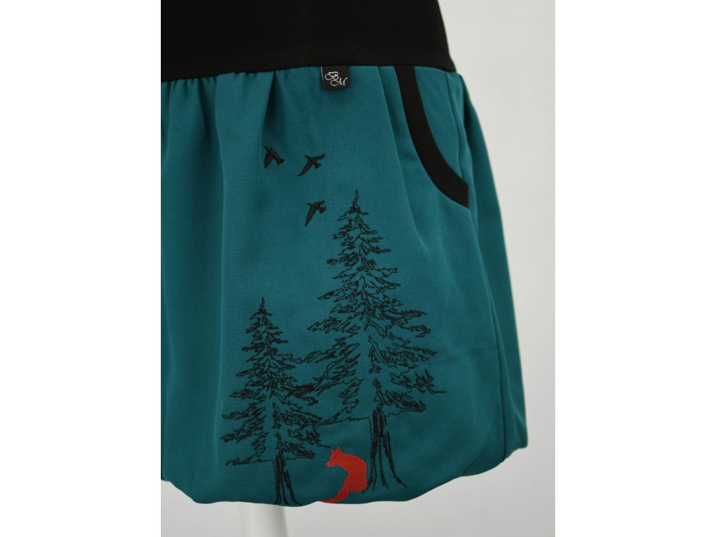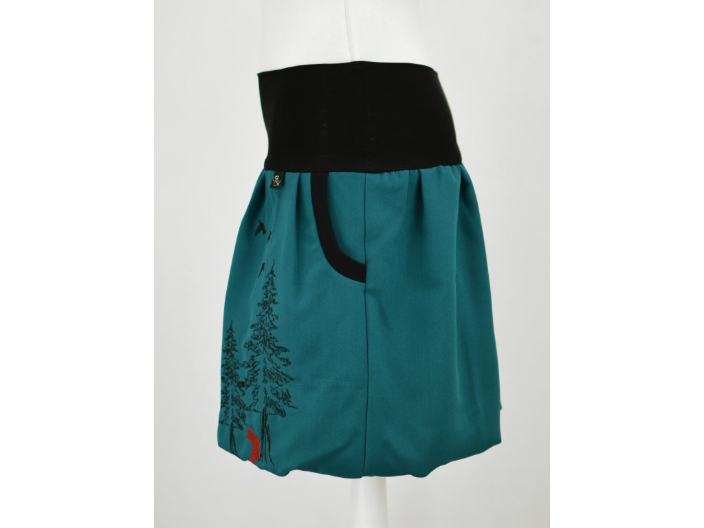 Dámská sukně balonového střihu s dvojitým elastickým pasovým okrajem vhodným pro většinu velikostí. Podšité polyesterovou látkou, která je vhodná jak na punčochy, tak holé nohy a sukně se dá nosit celoročně. Z rubu elastického pasu je nechán otvor na případné vložení gumy na zpevnění či stažení pasu – vhodné pro velikost XS.