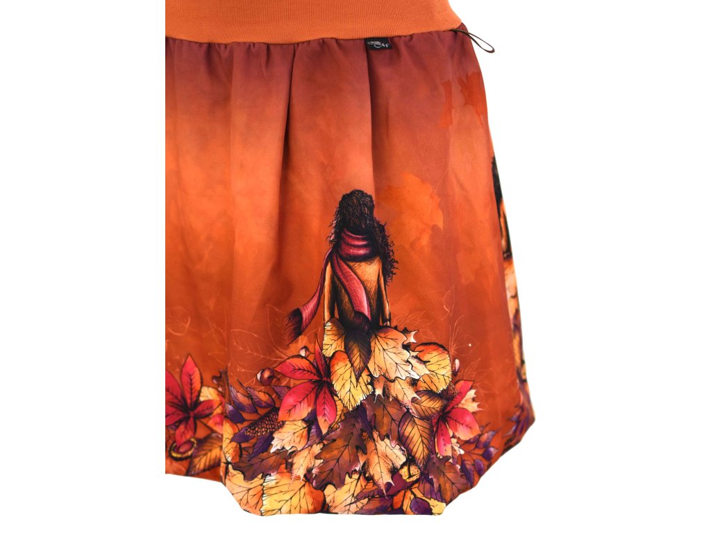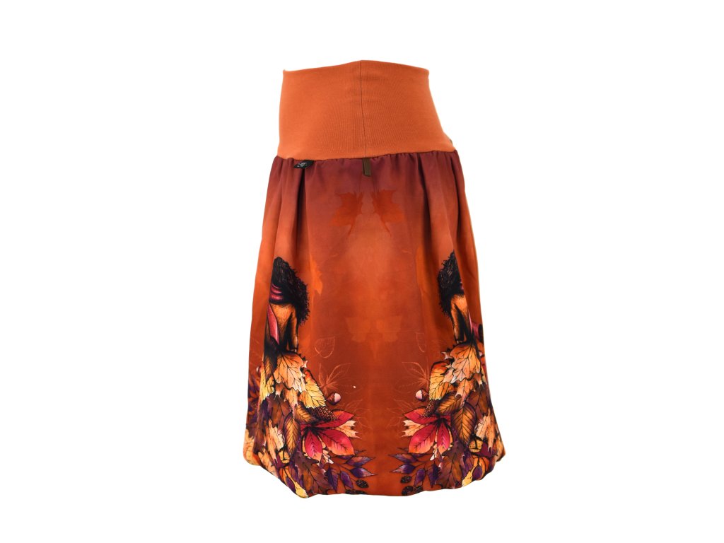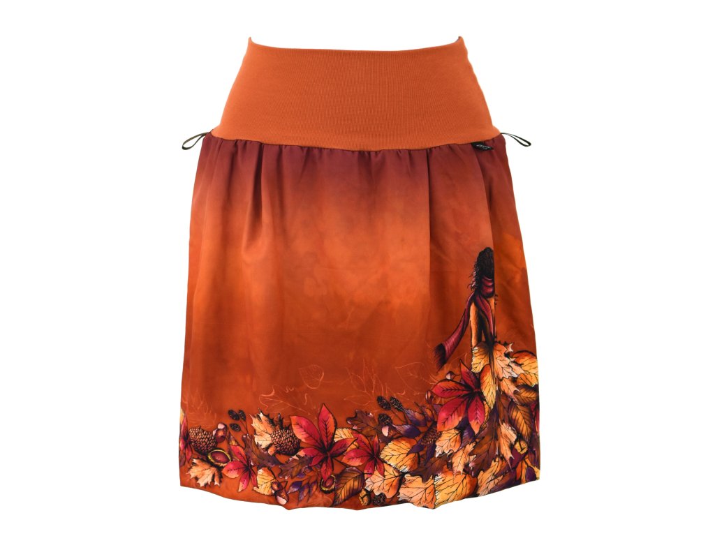 Dámská sukně balonového střihu s dvojitým elastickým pasovým okrajem vhodným pro většinu velikostí. Podšité polyesterovou látkou, která je vhodná jak na punčochy, tak holé nohy a sukně se dá nosit celoročně. Z rubu elastického pasu je nechán otvor na případné vložení gumy na zpevnění či stažení pasu – vhodné pro velikost XS.