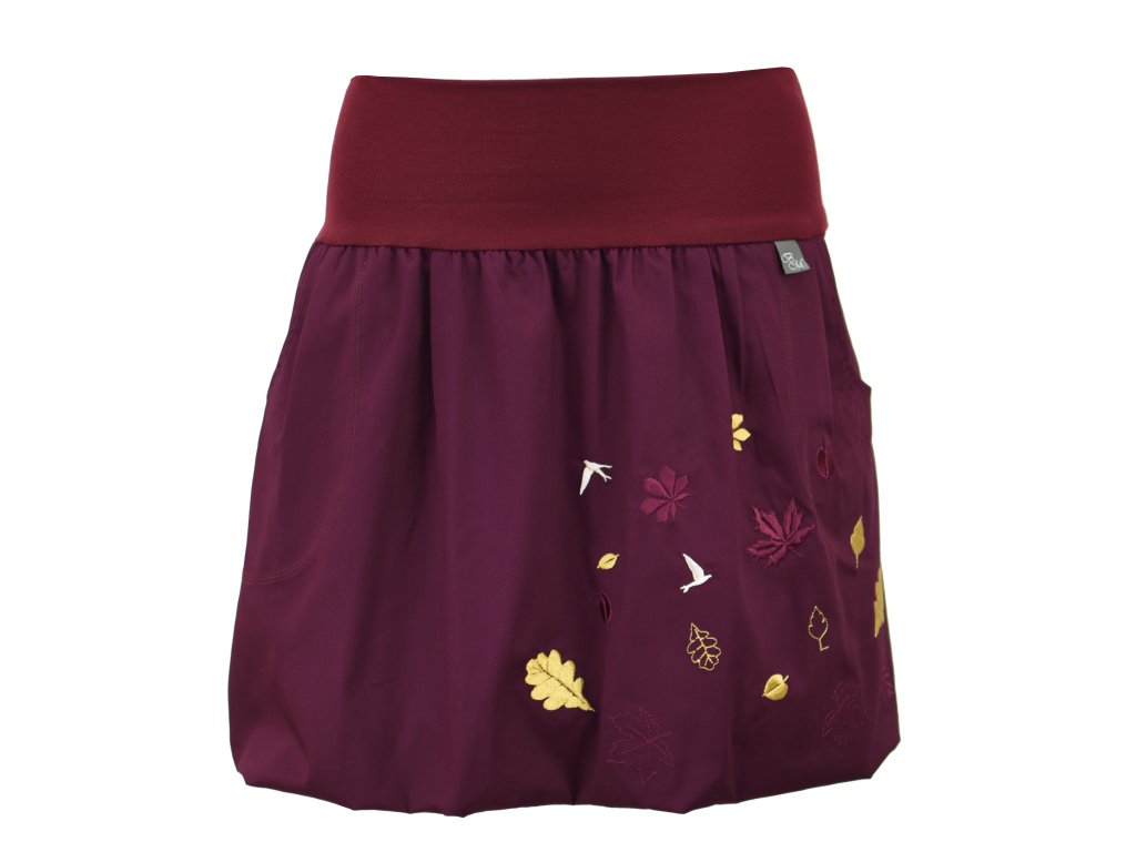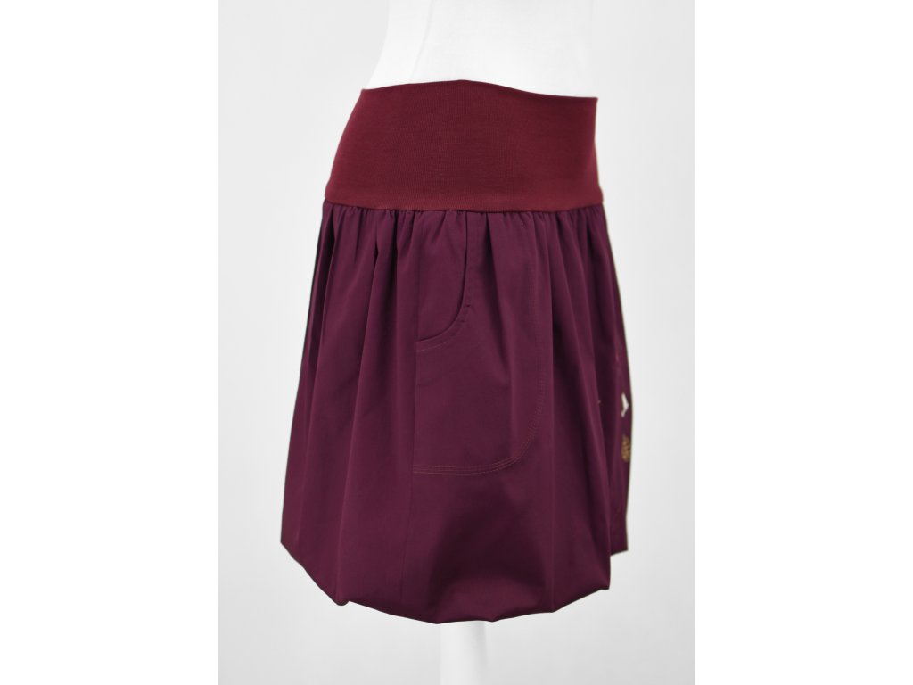 Dámská sukně balonového střihu s dvojitým elastickým pasovým okrajem vhodným pro většinu velikostí. Podšité polyesterovou látkou, která je vhodná jak na punčochy, tak holé nohy a sukně se dá nosit celoročně. Z rubu elastického pasu je nechán otvor na případné vložení gumy na zpevnění či stažení pasu – vhodné pro velikost XS.
