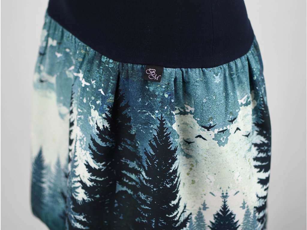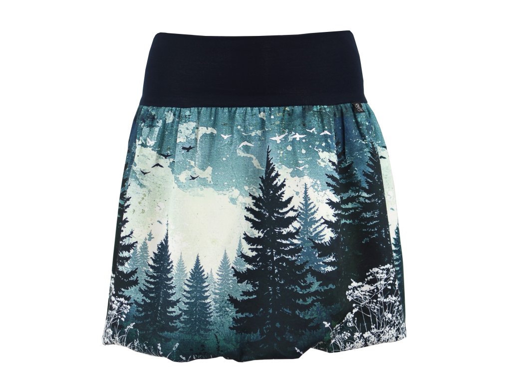 Dámská sukně balonového střihu s dvojitým elastickým pasovým okrajem vhodným pro většinu velikostí. Podšité polyesterovou látkou, která je vhodná jak na punčochy, tak holé nohy a sukně se dá nosit celoročně. Z rubu elastického pasu je nechán otvor na případné vložení gumy na zpevnění či stažení pasu – vhodné pro velikost XS.