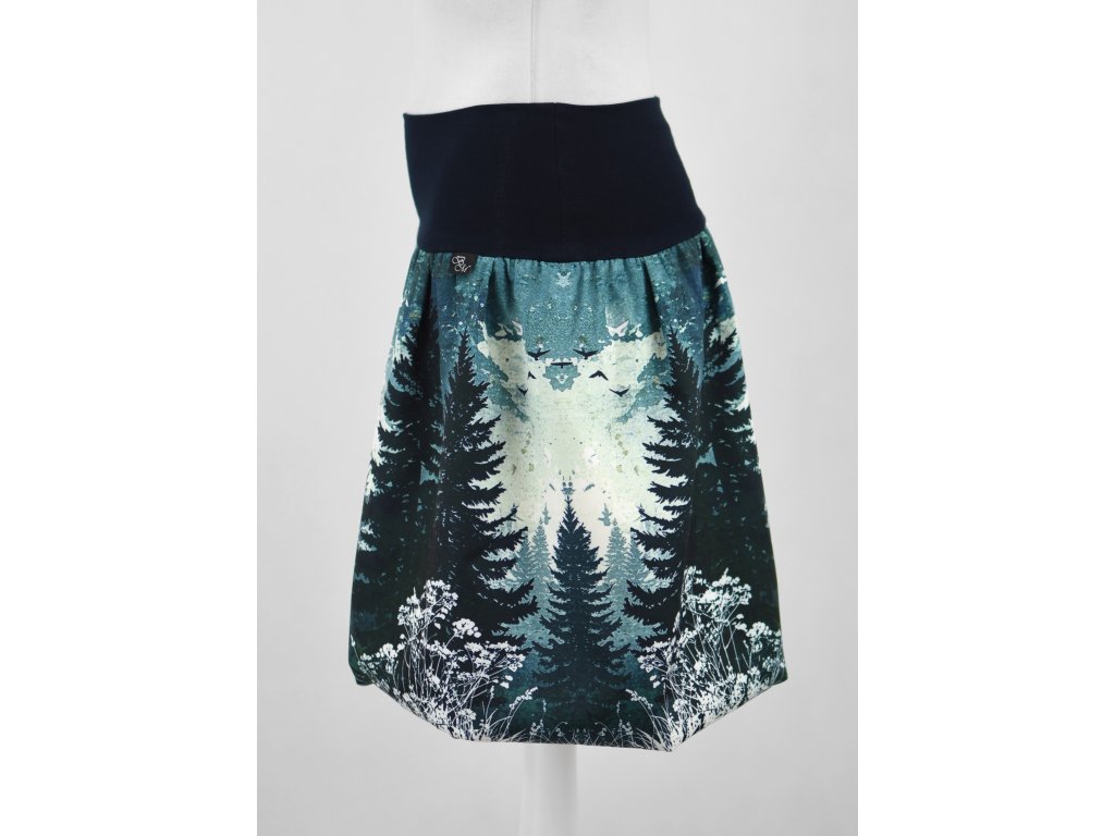Dámská sukně balonového střihu s dvojitým elastickým pasovým okrajem vhodným pro většinu velikostí. Podšité polyesterovou látkou, která je vhodná jak na punčochy, tak holé nohy a sukně se dá nosit celoročně. Z rubu elastického pasu je nechán otvor na případné vložení gumy na zpevnění či stažení pasu – vhodné pro velikost XS.