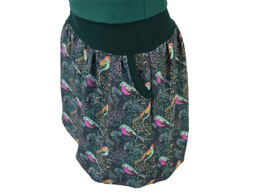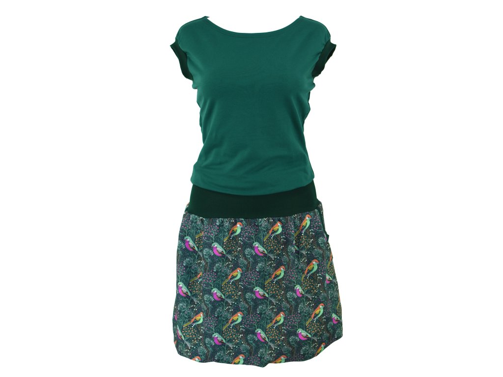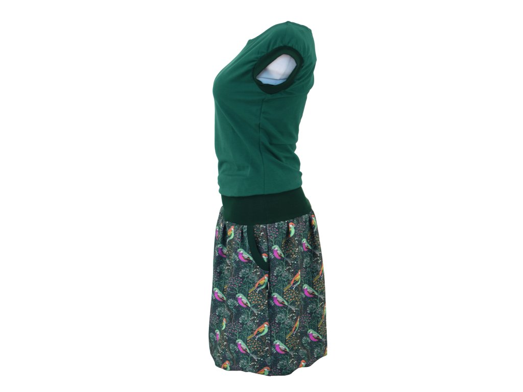 Dámská šatovka přestřižená v bocích s pasovým nápletem, šatovka se tak dá podkasat. Sukně je vypodšívkovaná s kapsami v bocích, průramky lemované úpletem.