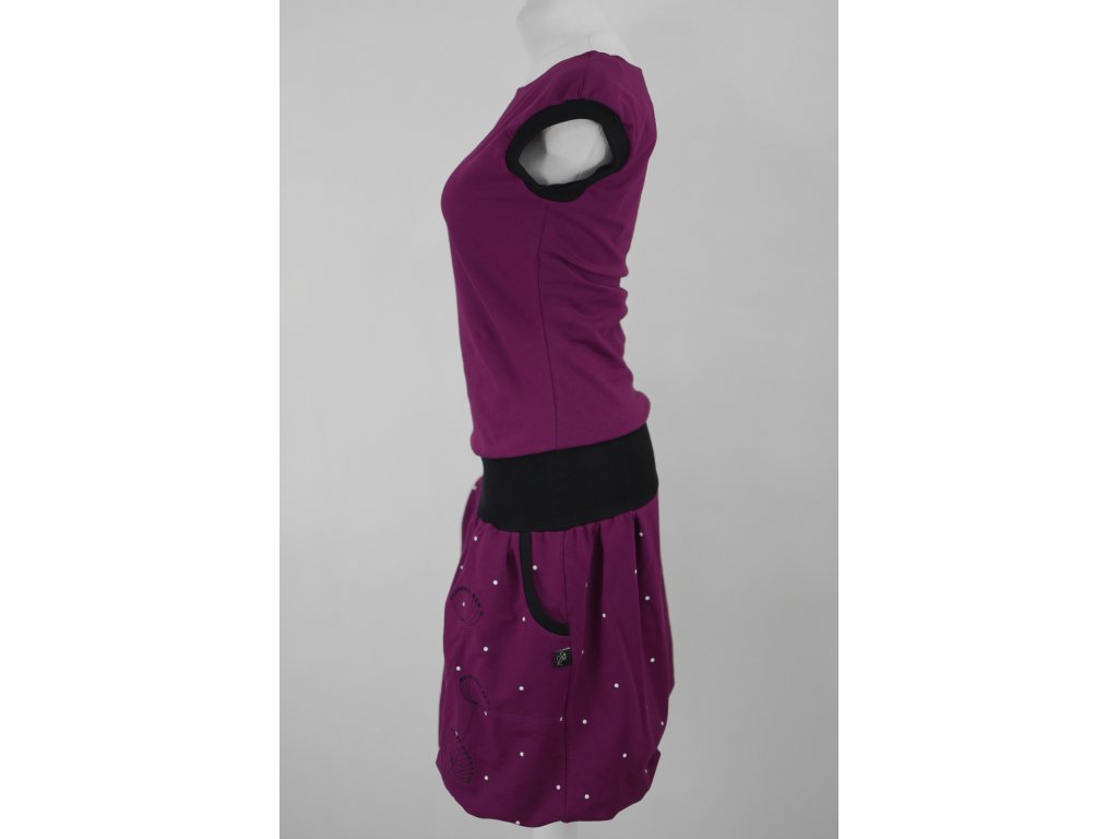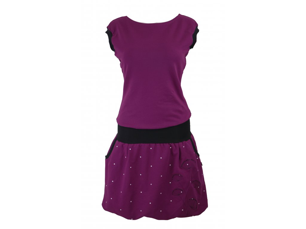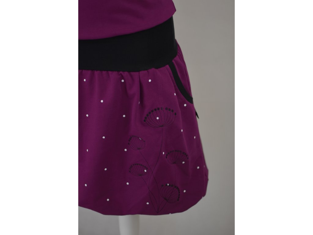 Dámská šatovka přestřižená v bocích s pasovým nápletem, šatovka se tak dá podkasat. Sukně je vypodšívkovaná s kapsami v bocích, průramky lemované úpletem.