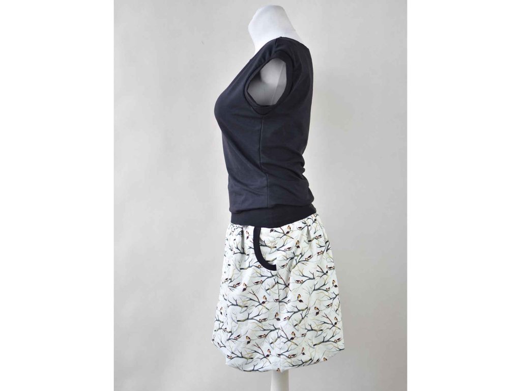 Dámská šatovka přestřižená v bocích s pasovým nápletem, šatovka se tak dá podkasat. Sukně je vypodšívkovaná s kapsami v bocích, průramky lemované úpletem.